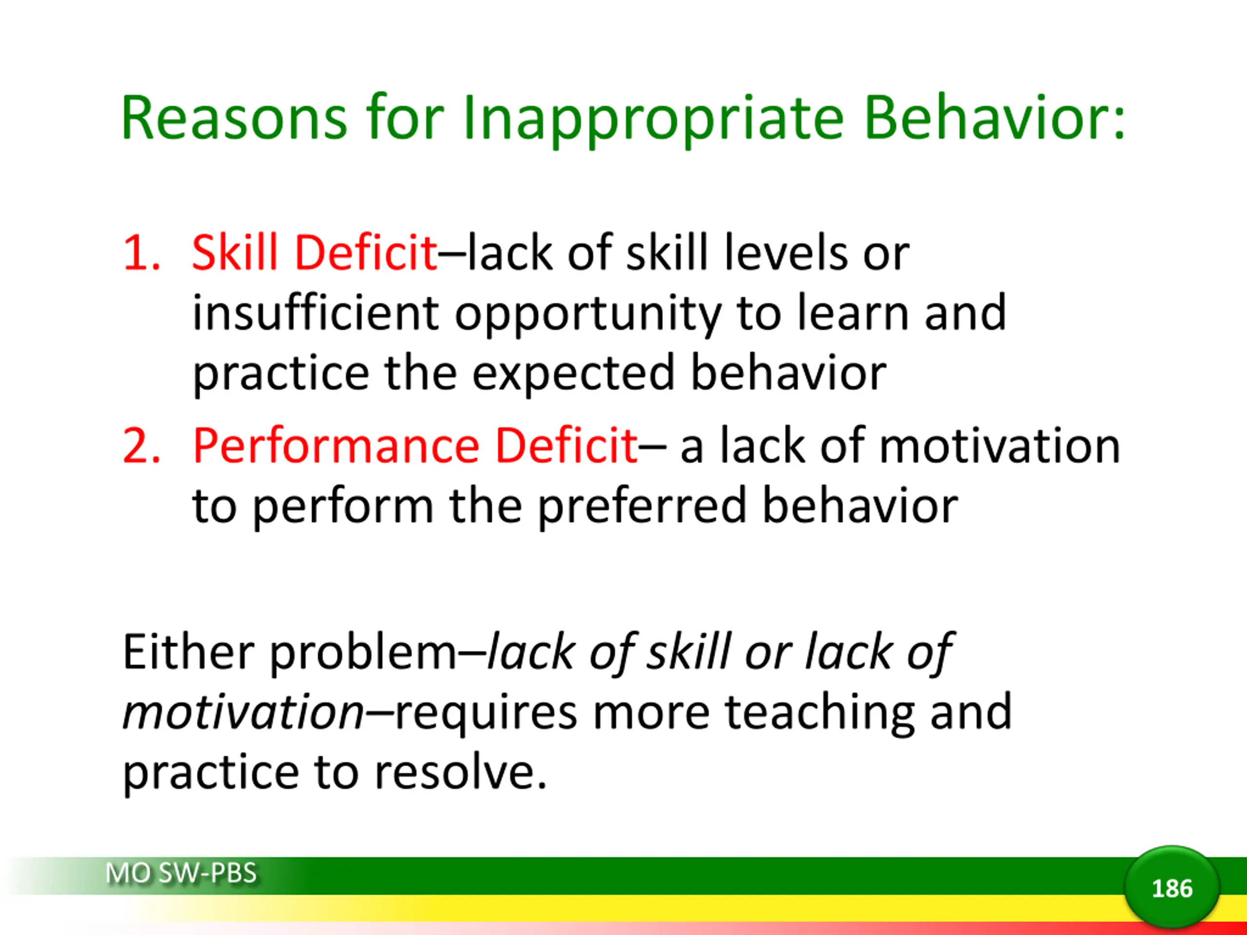 Reasons for Inappropriate Behavior: 1. Skill Deficit lack of skill levels or insufficient opportunity to learn and practice the expected behavior 2. Performance Deficit a lack of motivation to perform the preferred behavior Either problem lack of skill or lack of motivation requires more teaching and practice to resolve. MO SW-PBS 186