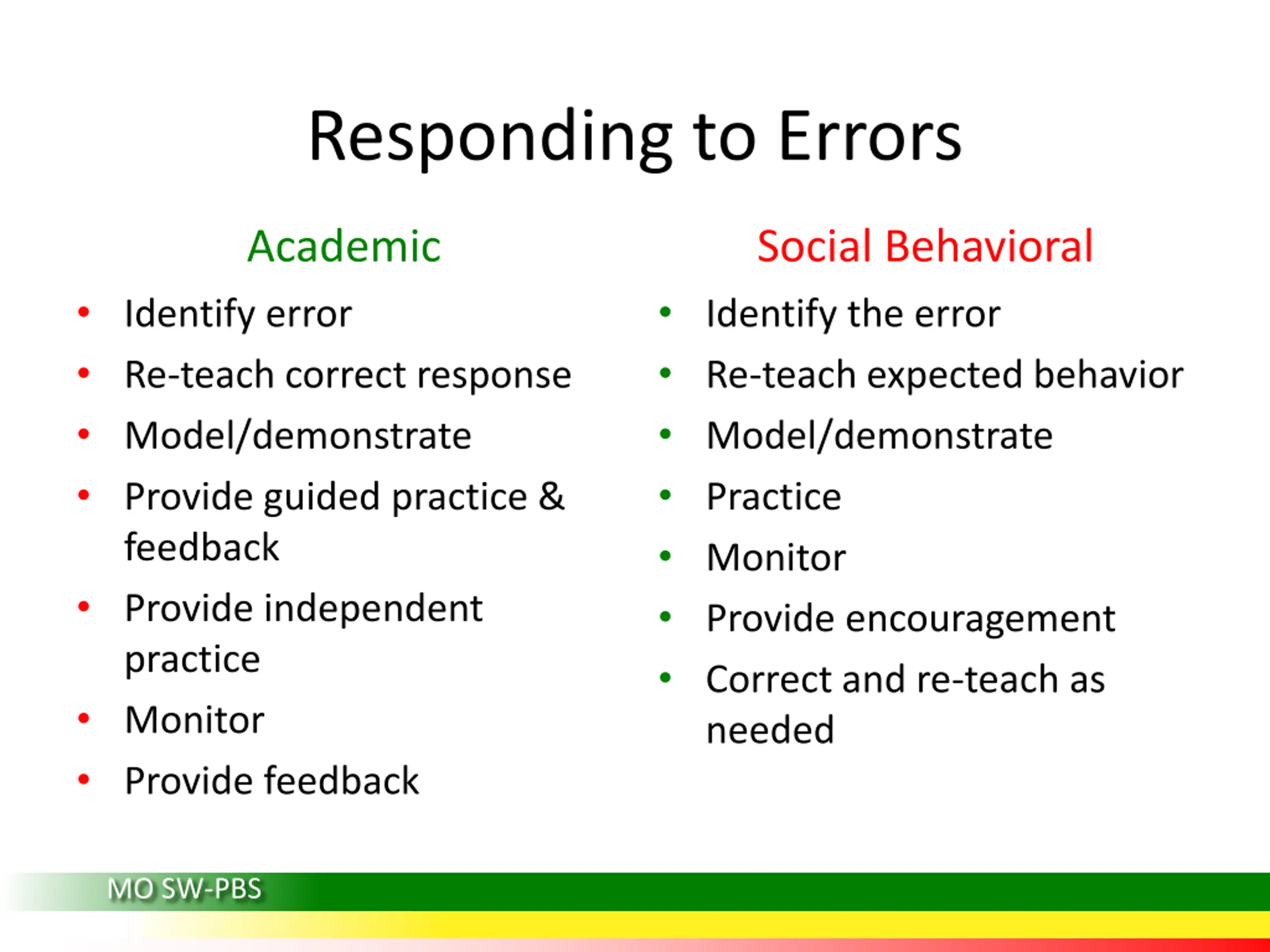 Responding to Errors Academic Social Behavioral Identify the error Re-teach expected behavior Model/demonstrate Practice Monitor Provide encouragement Correct and re-teach as needed Identify error Re-teach correct response Model/demonstrate Provide guided practice & feedback Provide independent practice Monitor Provide feedback MO SW-PBS