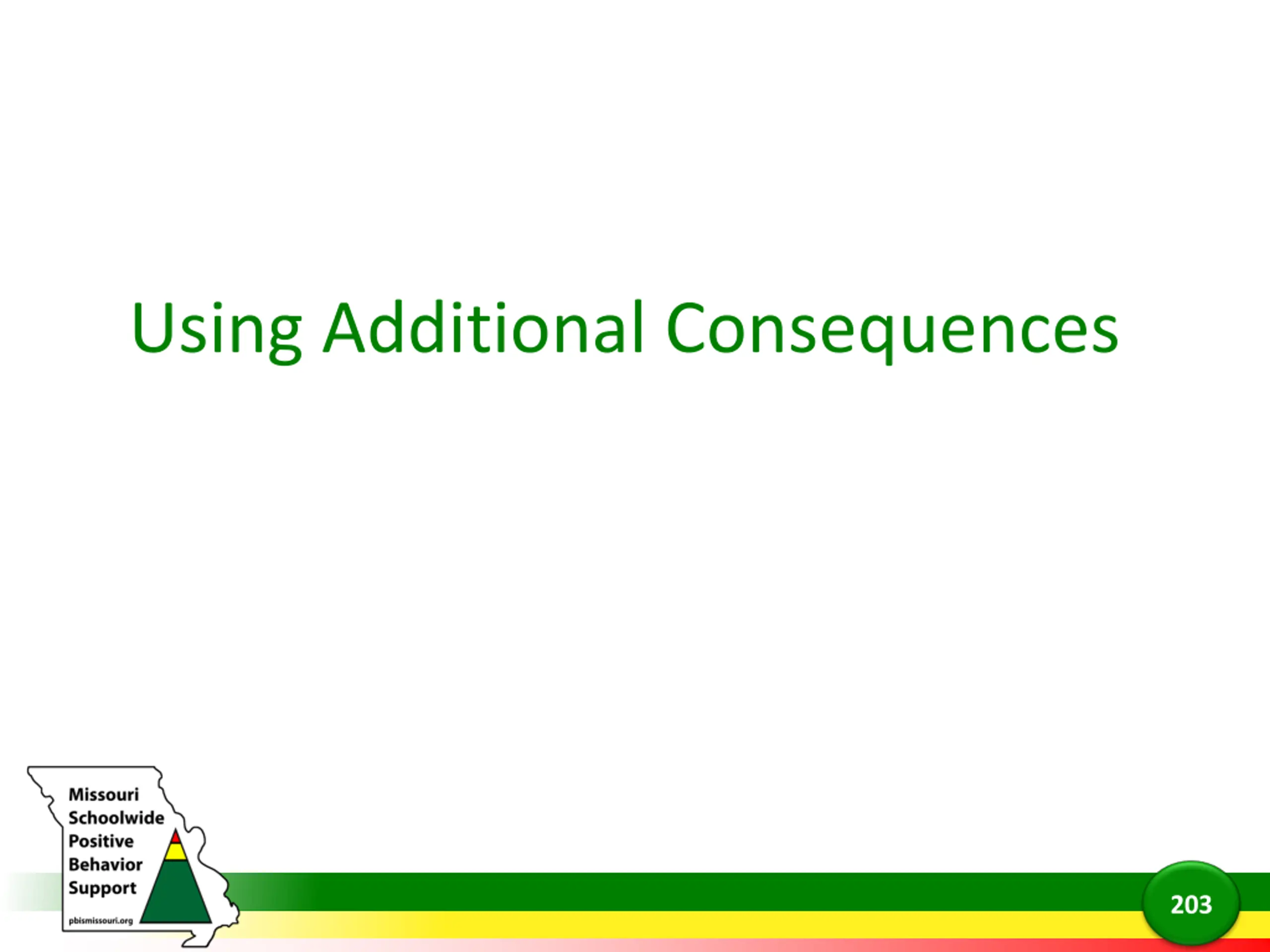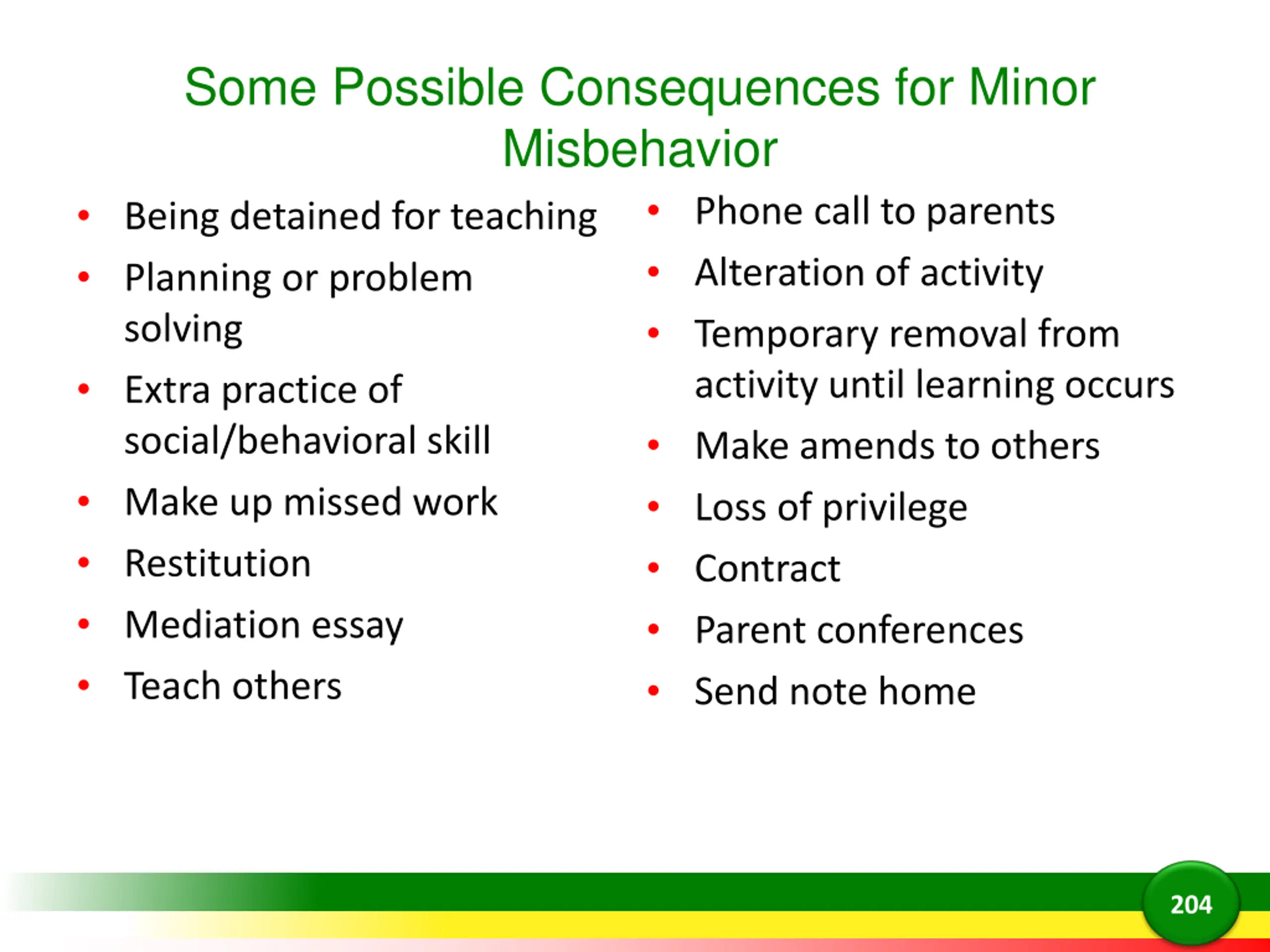 Some Possible Consequences for Minor Misbehavior Being detained for teaching Planning or problem solving Extra practice of social/behavioral skill Make up missed work Restitution Mediation essay Teach others Phone call to parents Alteration of activity Temporary removal from activity until learning occurs Make amends to others Loss of privilege Contract Parent conferences Send note home 204