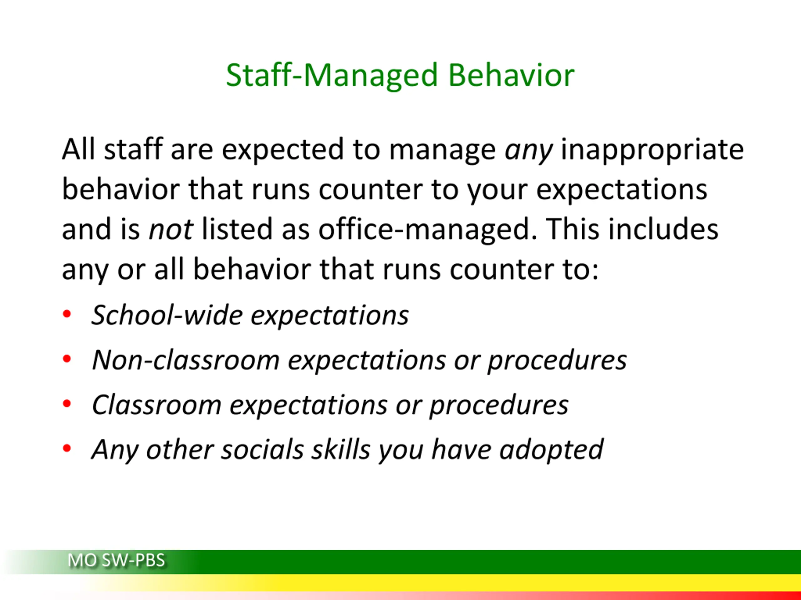 Staff-Managed Behavior All staff are expected to manage any inappropriate behavior that runs counter to your expectations and is not listed as office-managed. This includes any or all behavior that runs counter to: School-wide expectations Non-classroom expectations or procedures Classroom expectations or procedures Any other socials skills you have adopted MO SW-PBS