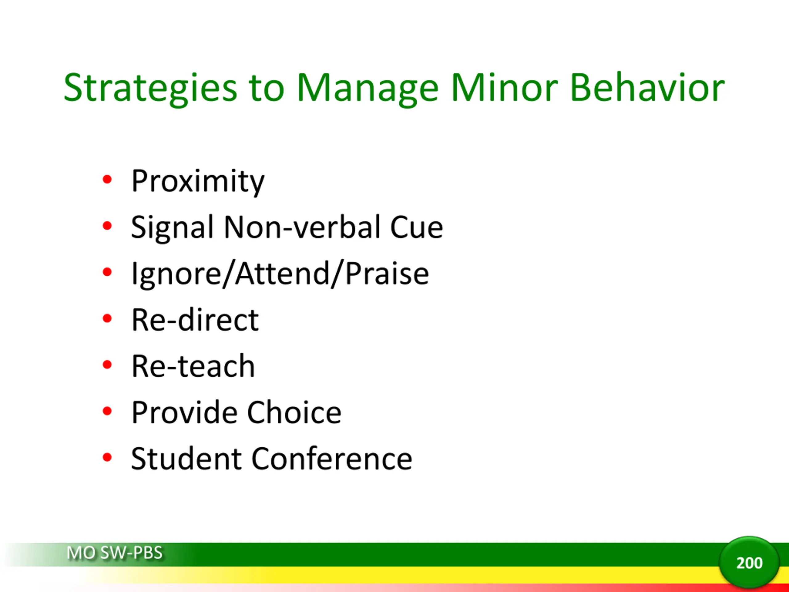 Strategies to Manage Minor Behavior Proximity Signal Non-verbal Cue Ignore/Attend/Praise Re-direct Re-teach Provide Choice Student Conference MO SW-PBS 200