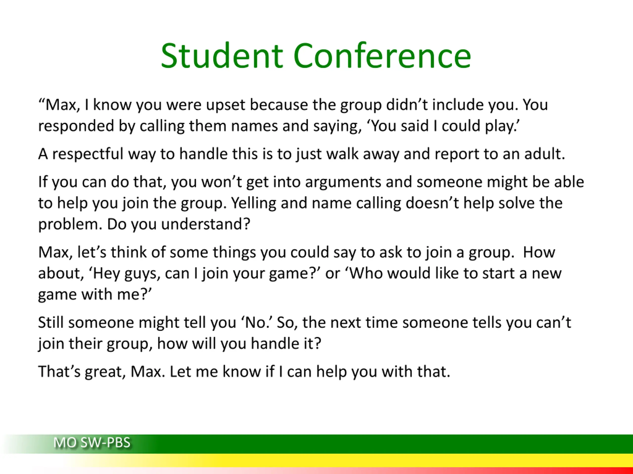 Student Conference Max, I know you were upset because the group didn t include you. You responded by calling them names and saying, You said I could play. A respectful way to handle this is to just walk away and report to an adult. If you can do that, you won t get into arguments and someone might be able to help you join the group. Yelling and name calling doesn t help solve the problem. Do you understand? Max, let s think of some things you could say to ask to join a group. How about, Hey guys, can I join your game? or Who would like to start a new game with me? Still someone might tell you No. So, the next time someone tells you can t join their group, how will you handle it? That s great, Max. Let me know if I can help you with that. MO SW-PBS