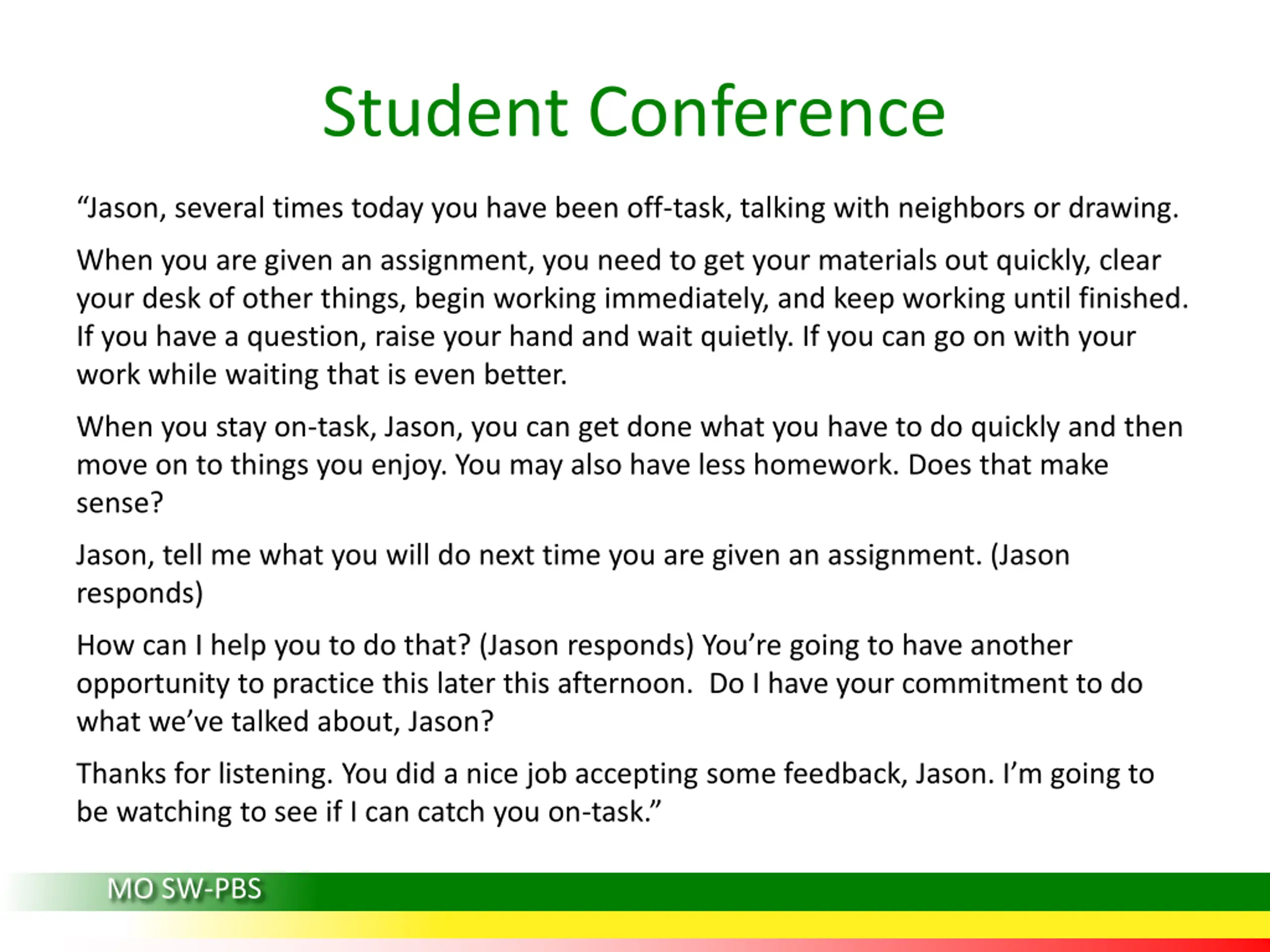 Student Conference Jason, several times today you have been off-task, talking with neighbors or drawing. When you are given an assignment, you need to get your materials out quickly, clear your desk of other things, begin working immediately, and keep working until finished. If you have a question, raise your hand and wait quietly. If you can go on with your work while waiting that is even better. When you stay on-task, Jason, you can get done what you have to do quickly and then move on to things you enjoy. You may also have less homework. Does that make sense? Jason, tell me what you will do next time you are given an assignment. (Jason responds) How can I help you to do that? (Jason responds) You re going to have another opportunity to practice this later this afternoon. Do I have your commitment to do what we ve talked about, Jason? Thanks for listening. You did a nice job accepting some feedback, Jason. I m going to be watching to see if I can catch you on-task. MO SW-PBS