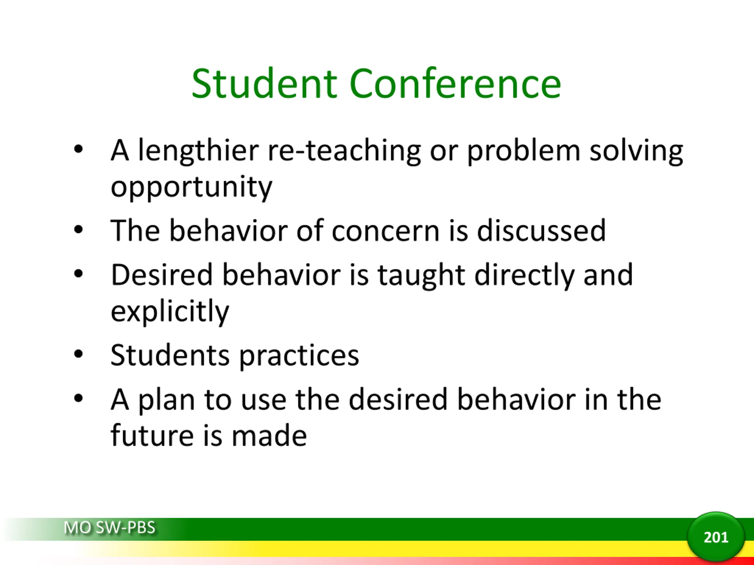Student Conference A lengthier re-teaching or problem solving opportunity The behavior of concern is discussed Desired behavior is taught directly and explicitly Students practices A plan to use the desired behavior in the future is made MO SW-PBS 201