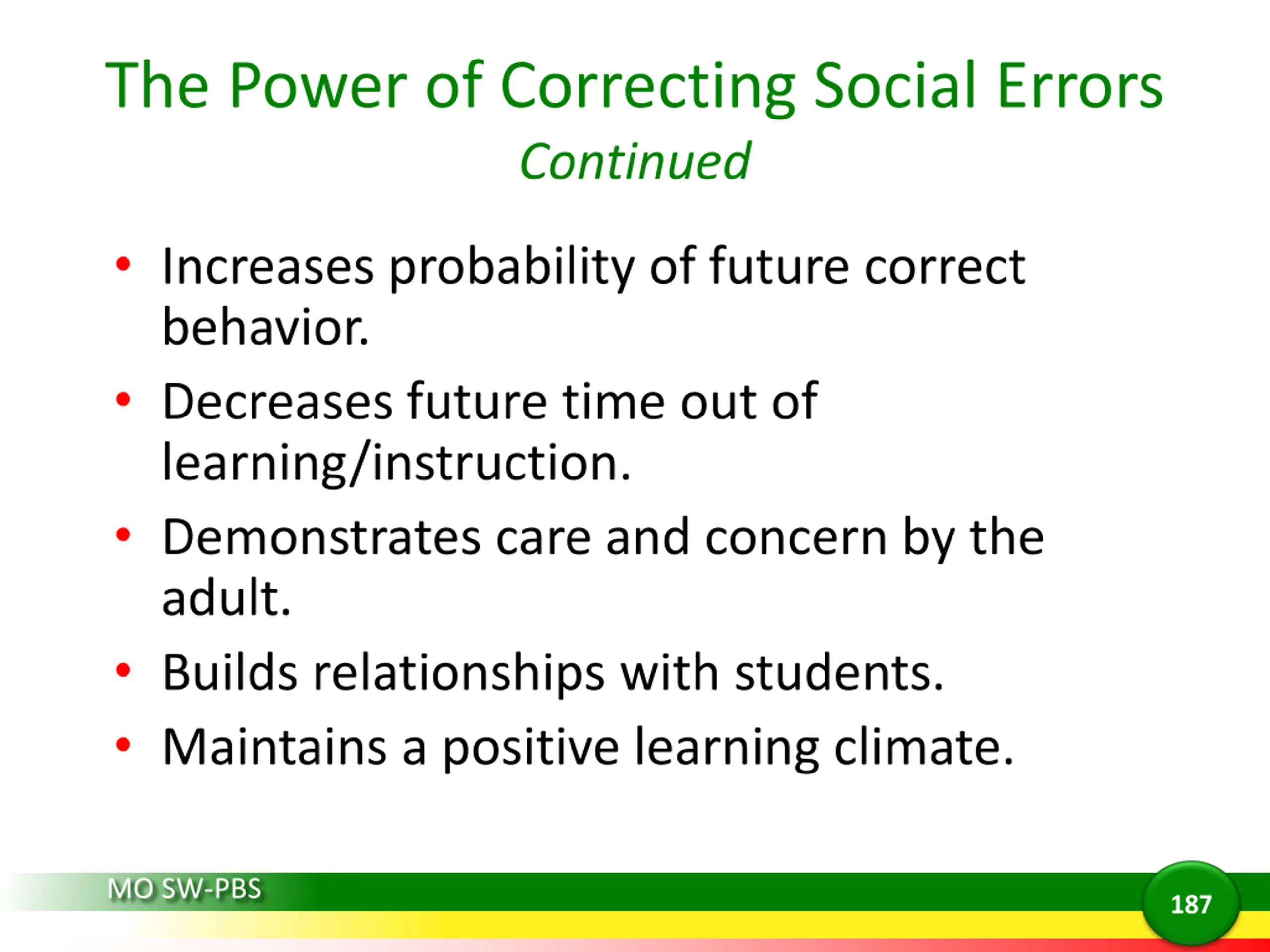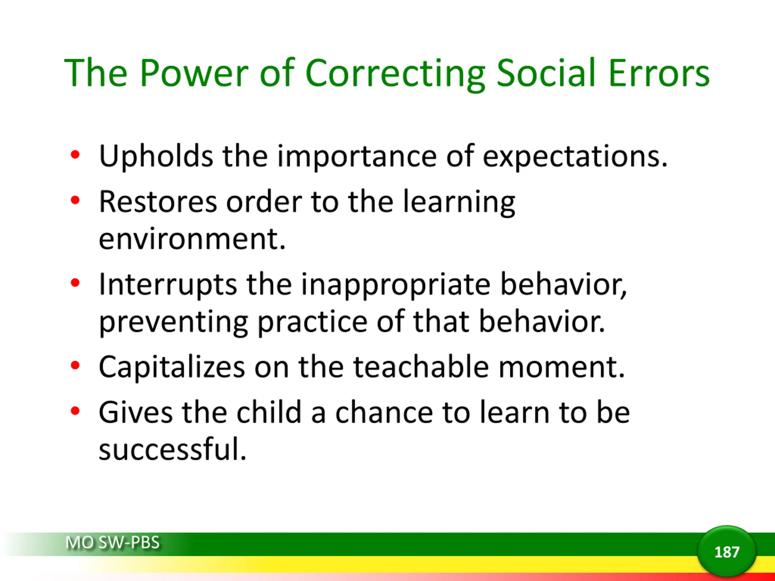 The Power of Correcting Social Errors Upholds the importance of expectations. Restores order to the learning environment. Interrupts the inappropriate behavior, preventing practice of that behavior. Capitalizes on the teachable moment. Gives the child a chance to learn to be successful. MO SW-PBS 187