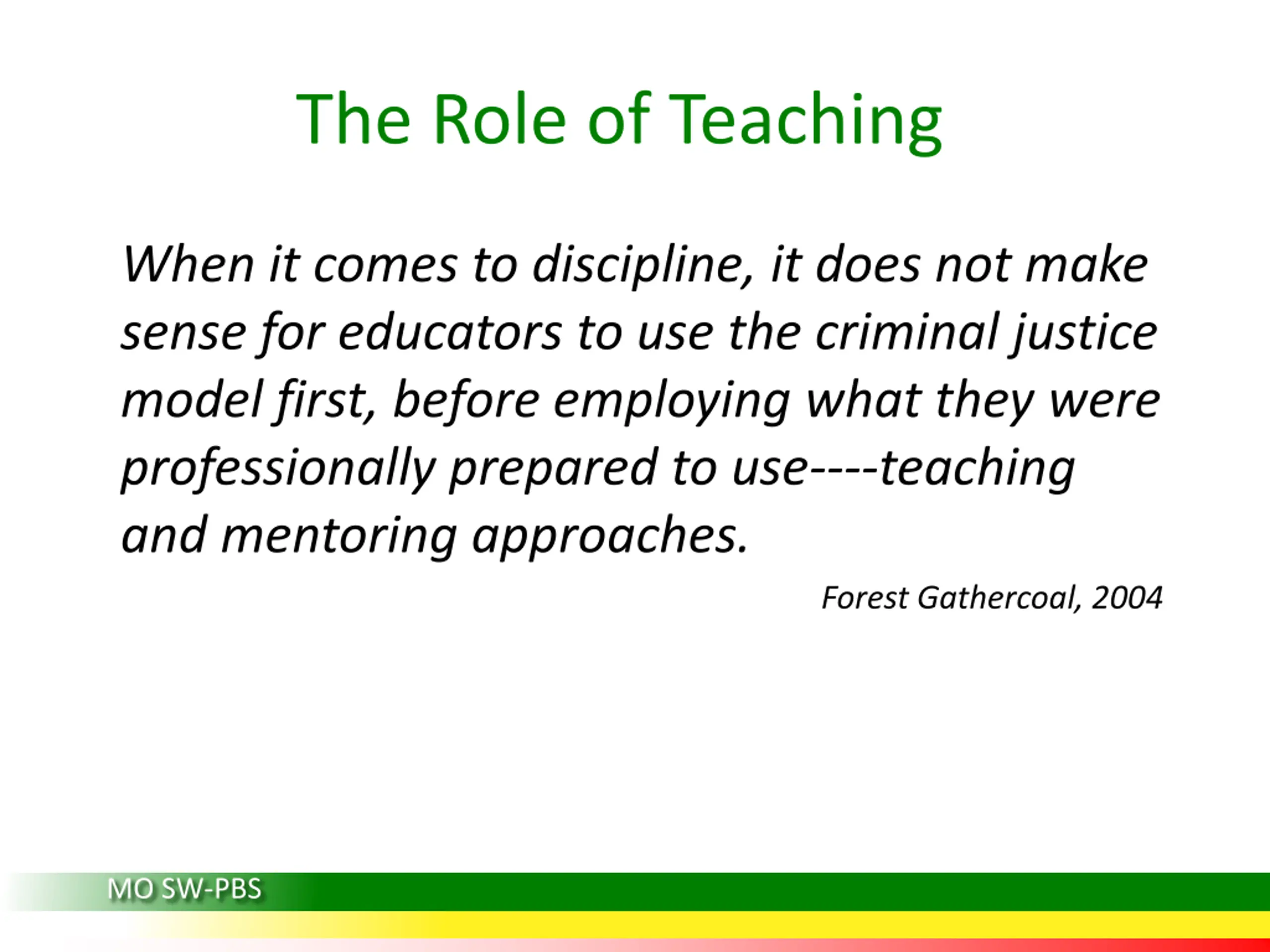 The Role of Teaching When it comes to discipline, it does not make sense for educators to use the criminal justice model first, before employing what they were professionally prepared to use----teaching and mentoring approaches. Forest Gathercoal, 2004 MO SW-PBS