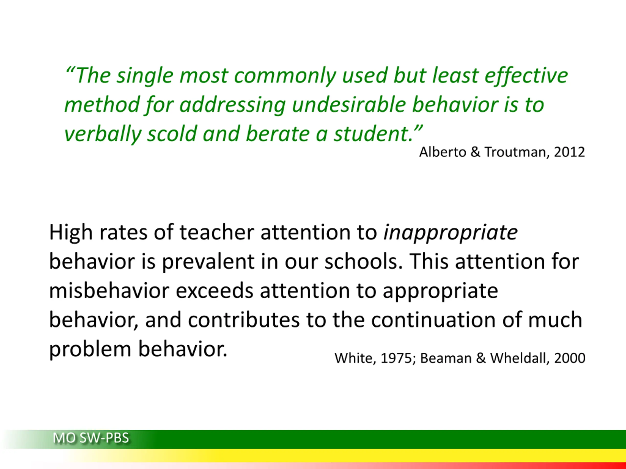 The single most commonly used but least effective method for addressing undesirable behavior is to verbally scold and berate a student. Alberto & Troutman, 2012 High rates of teacher attention to inappropriate behavior is prevalent in our schools. This attention for misbehavior exceeds attention to appropriate behavior, and contributes to the continuation of much problem behavior. White, 1975; Beaman & Wheldall, 2000 MO SW-PBS