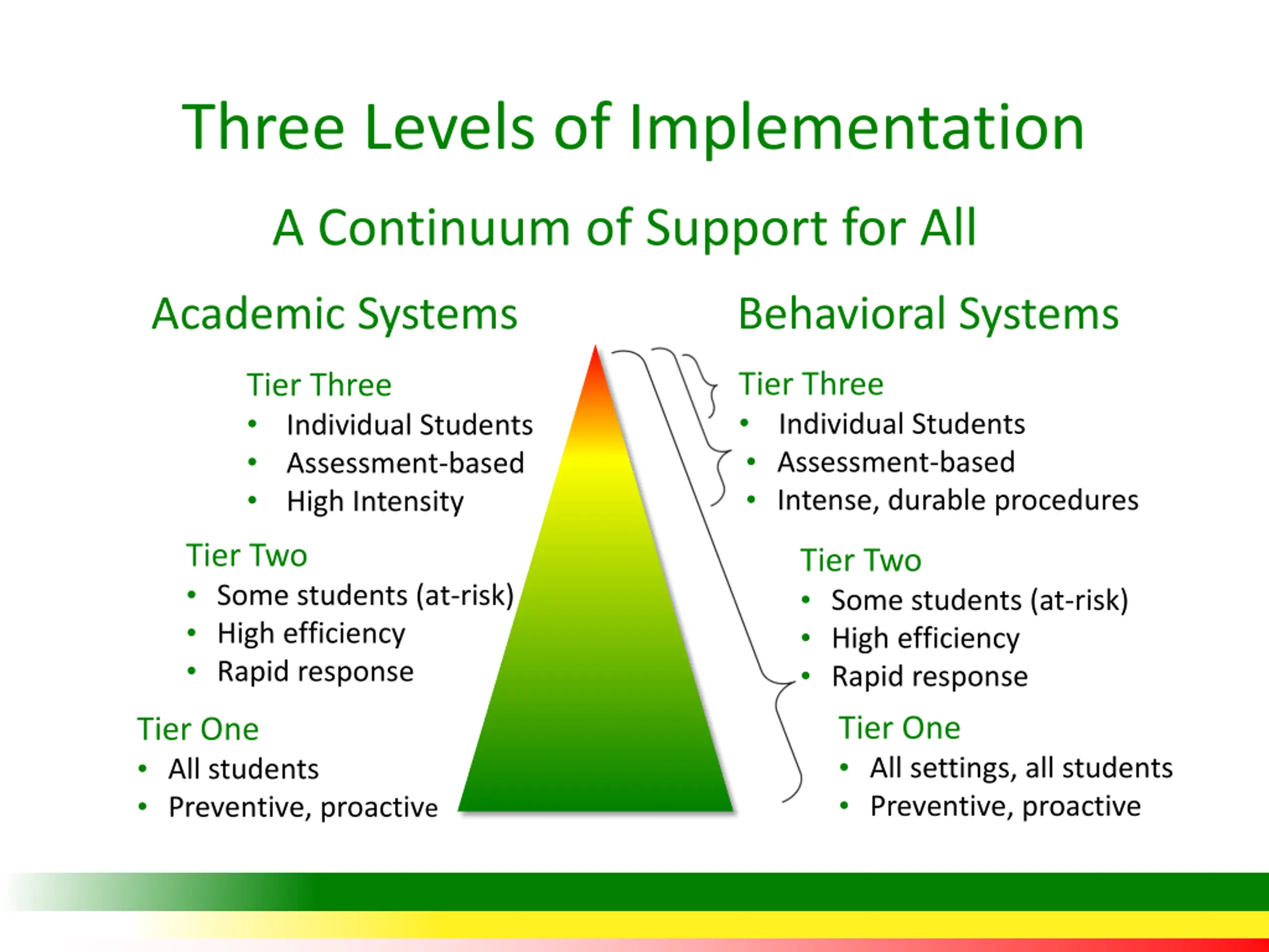 Three Levels of Implementation A Continuum of Support for All Academic Systems Behavioral Systems Tier Three Individual Students Assessment-based Intense, durable procedures Tier Three Individual Students Assessment-based High Intensity Tier Two Some students (at-risk) High efficiency Rapid response Tier Two Some students (at-risk) High efficiency Rapid response Tier One All settings, all students Preventive, proactive Tier One All students Preventive, proactive