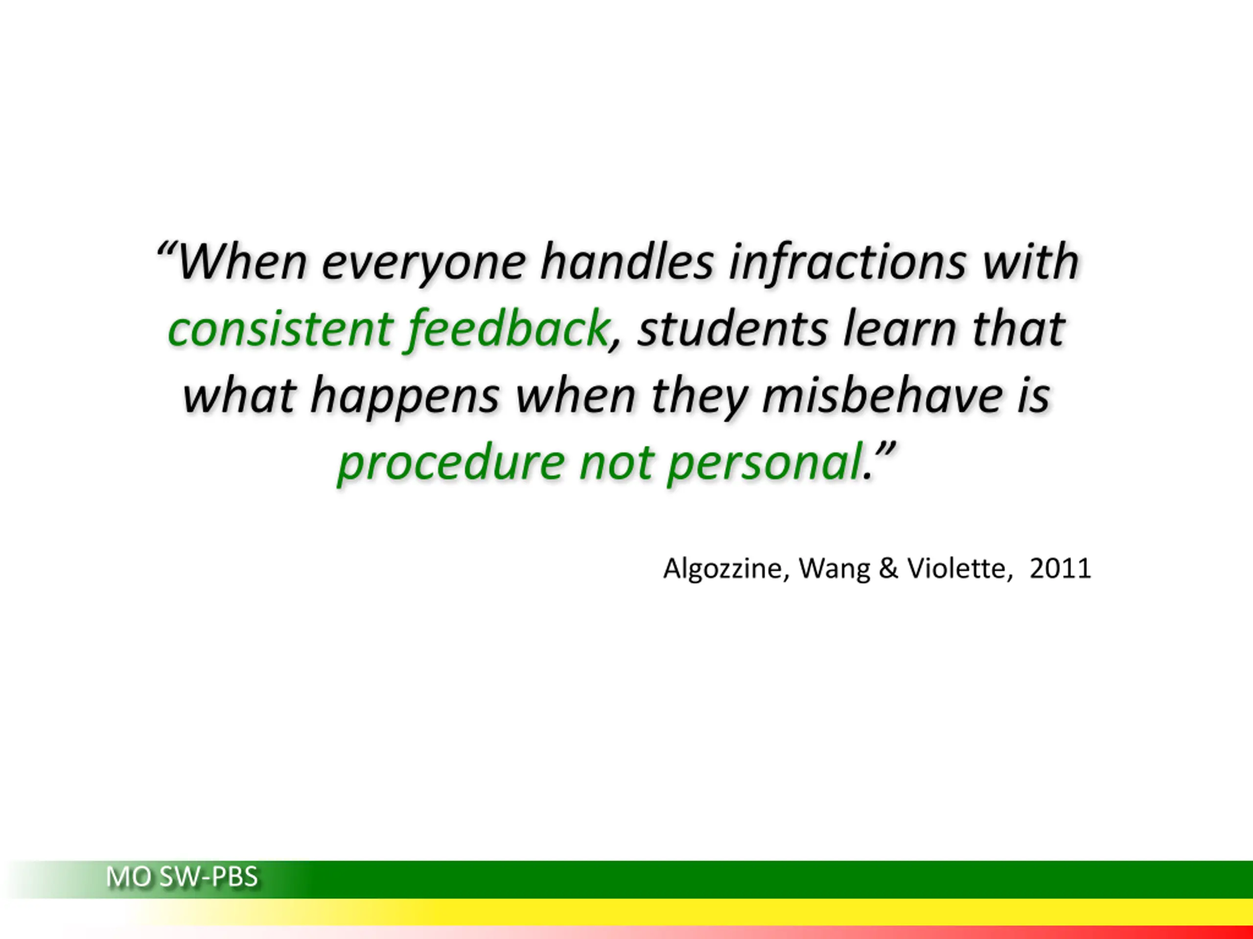 When everyone handles infractions with consistent feedback, students learn that what happens when they misbehave is procedure not personal. Algozzine, Wang & Violette, 2011 MO SW-PBS