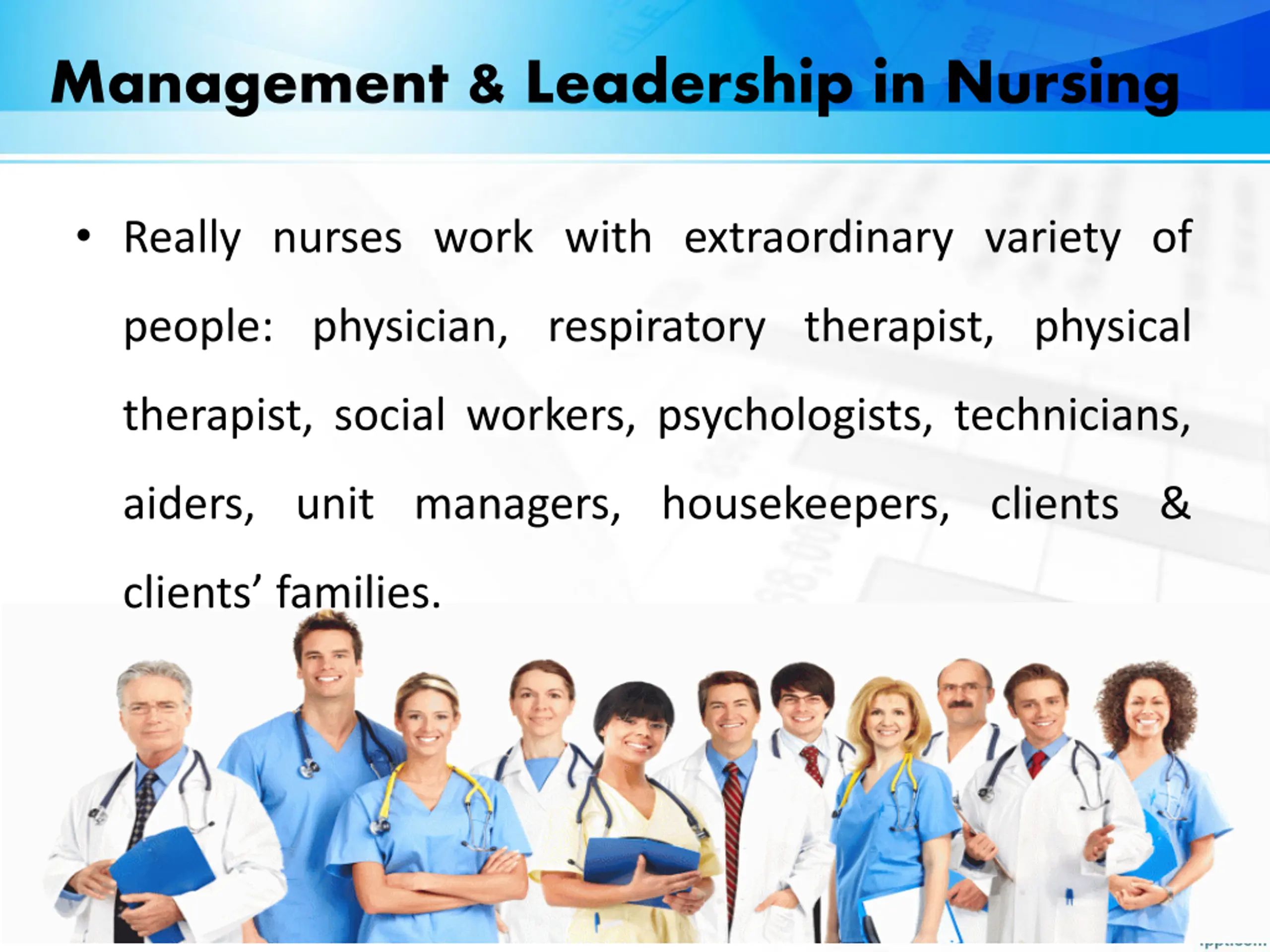 Management & Leadership in Nursing Really nurses work with extraordinary variety of people: physician, respiratory therapist, physical therapist, social workers, psychologists, technicians, aiders, unit managers, housekeepers, clients & clients families.
