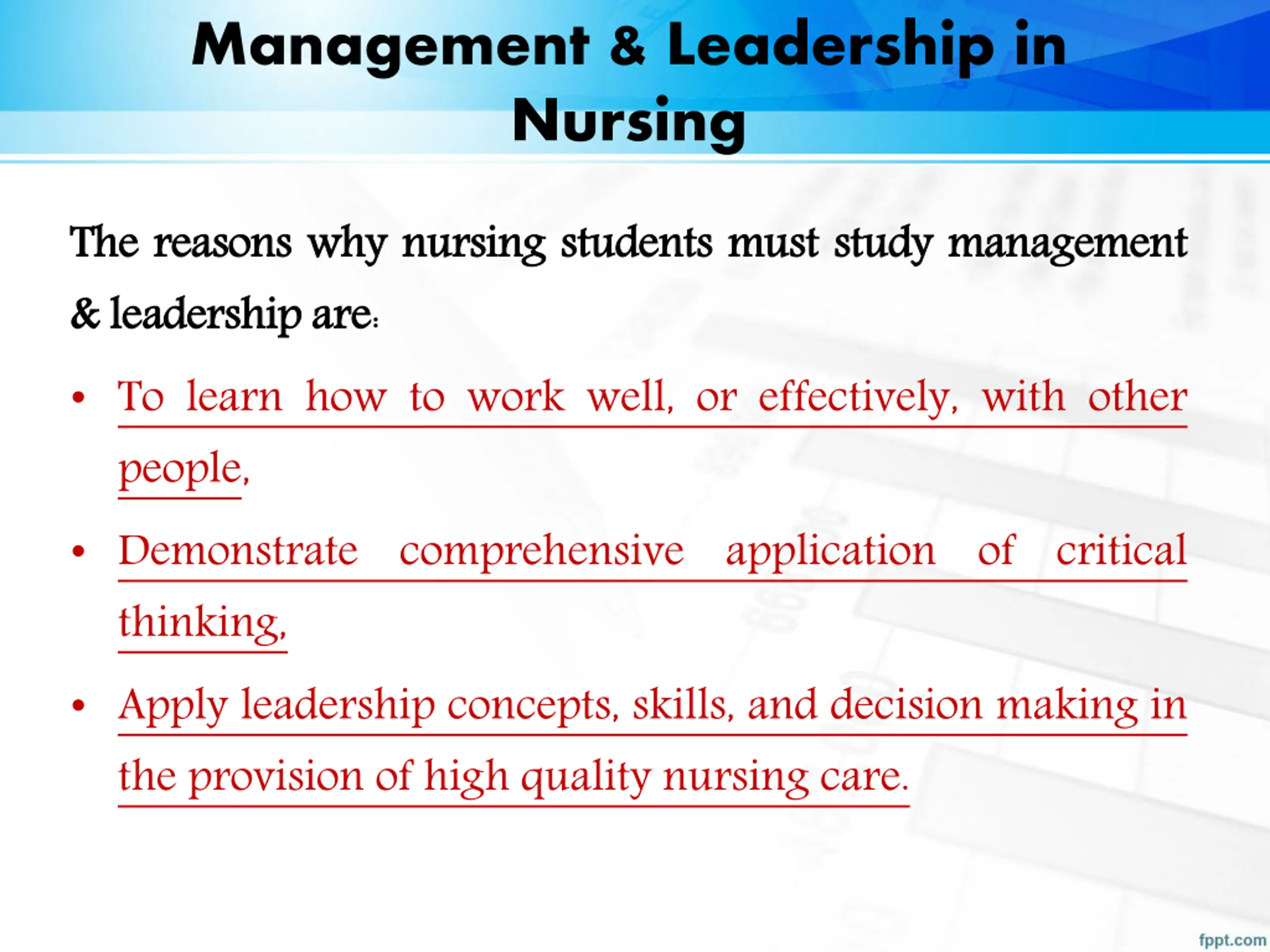 Management & Leadership in Nursing The & & leadership To learn how to work well, or effectively, with other people, Demonstrate comprehensive application of critical thinking, Apply leadership concepts, skills, and decision making in the provision of high quality nursing care. The reasons leadership are reasons why why nursing are: nursing students students must must study study management management