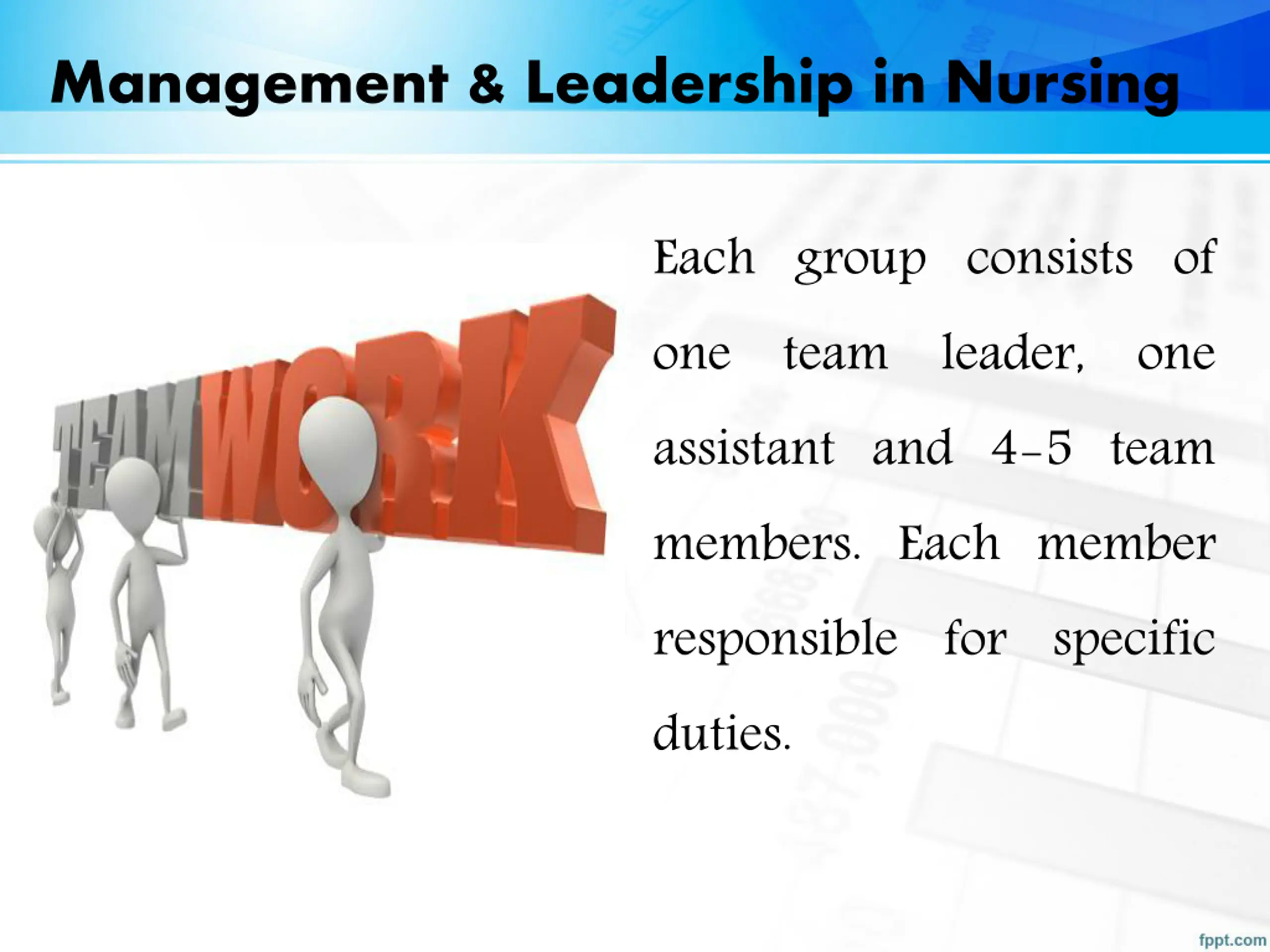 Management & Leadership in Nursing Each group consists of one team leader, one assistant and 4-5 team members. Each member responsible for specific duties.
