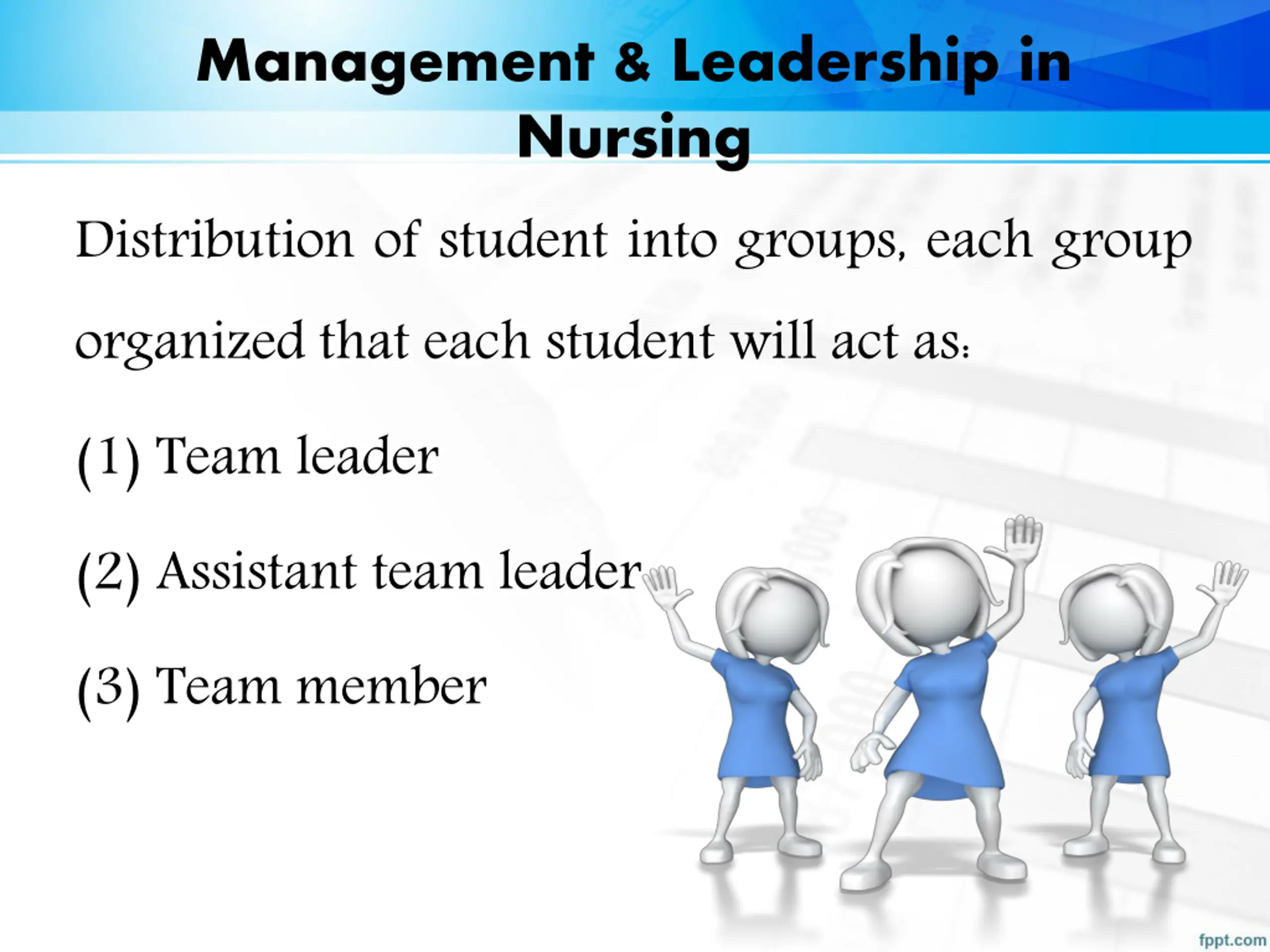 Management & Leadership in Nursing Distribution of student into groups, each group organized that each student will act as: (1) Team leader (2) Assistant team leader (3) Team member