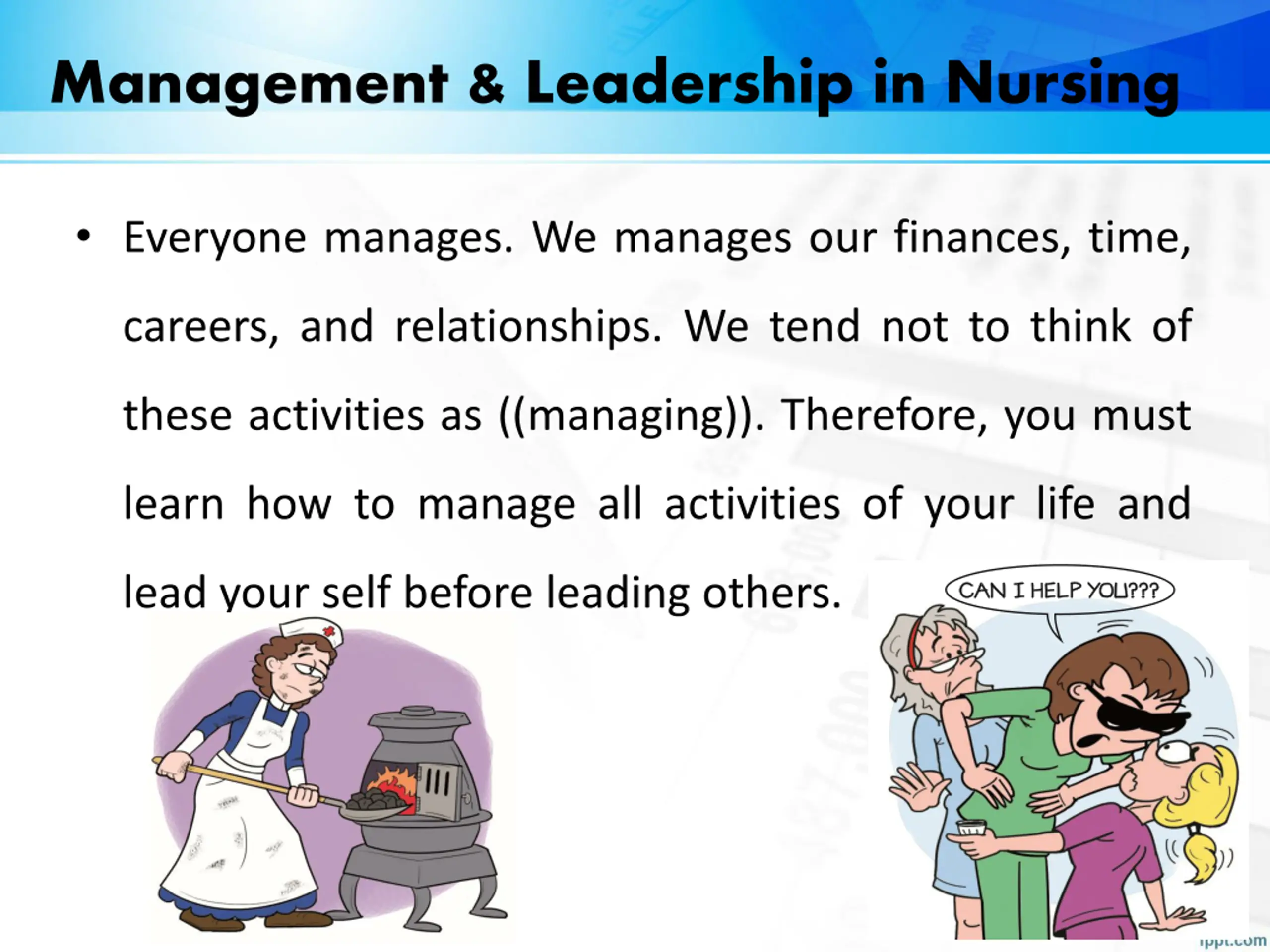 Management & Leadership in Nursing Everyone manages. We manages our finances, time, careers, and relationships. We tend not to think of these activities as ((managing)). Therefore, you must learn how to manage all activities of your life and lead your self before leading others.