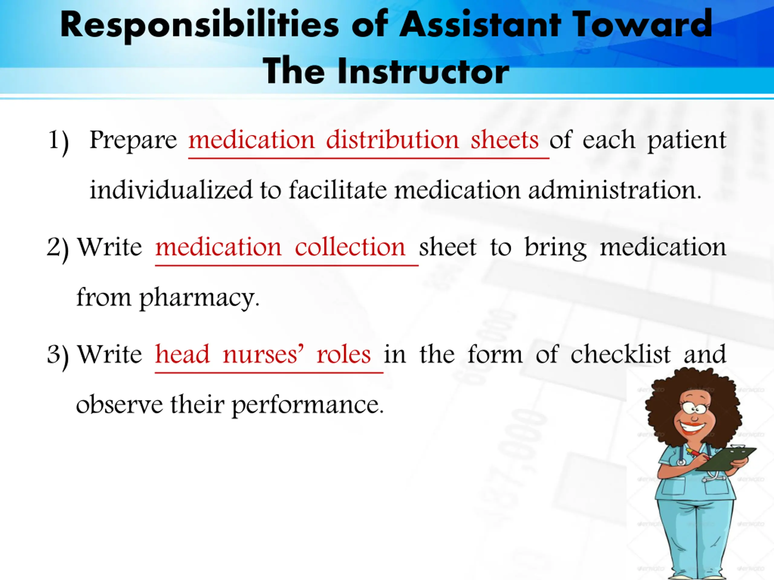 Responsibilities of Assistant Toward The Instructor 1) Prepare medication distribution sheets of each patient individualized to facilitate medication administration. 2) Write medication collection sheet to bring medication from pharmacy. 3) Write head nurses roles in the form of checklist and observe their performance.