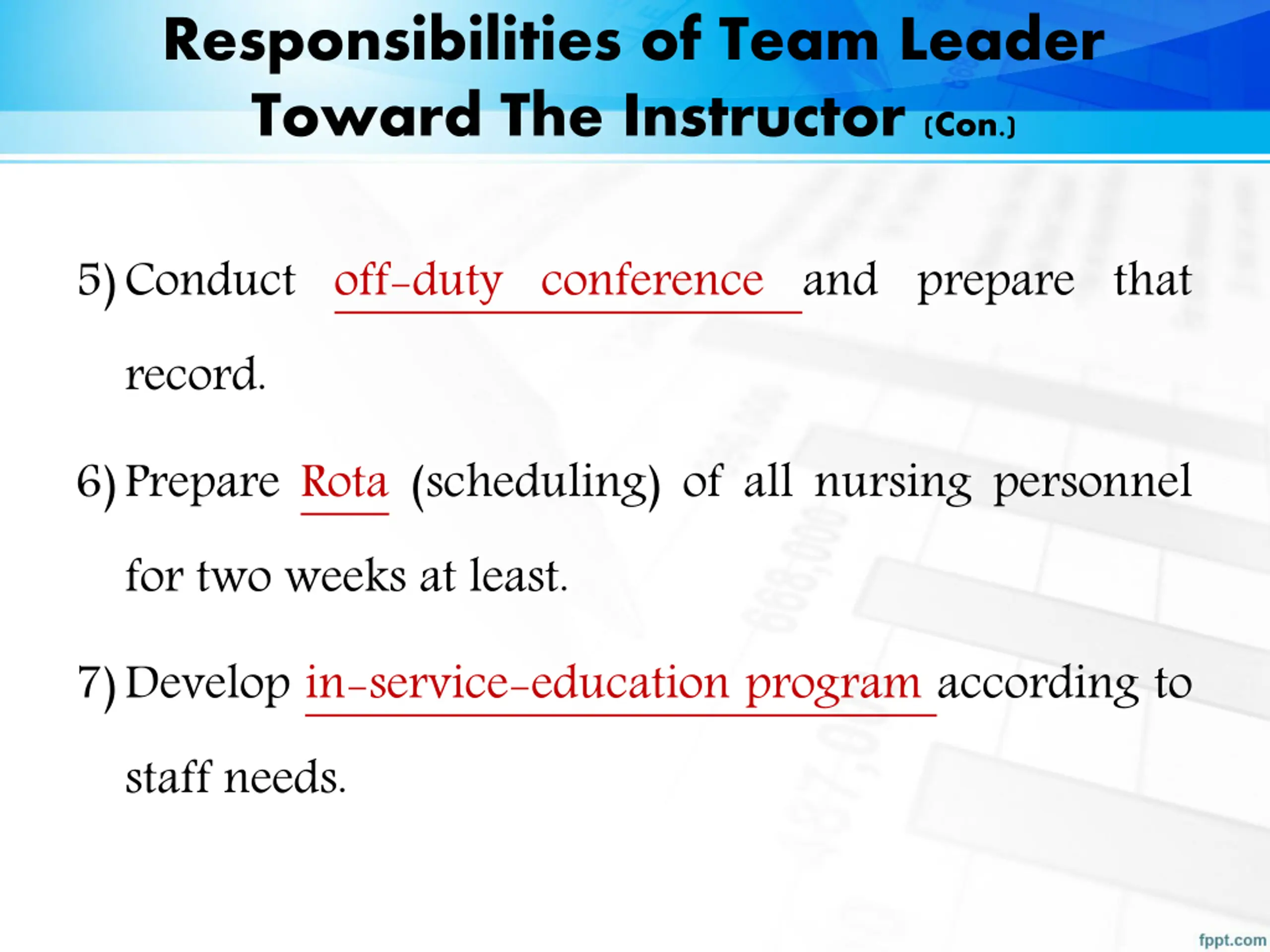 Responsibilities of Team Leader Toward The Instructor (Con.) 5)Conduct off-duty conference and prepare that record. 6)Prepare Rota (scheduling) of all nursing personnel for two weeks at least. 7)Develop in-service-education program according to staff needs.