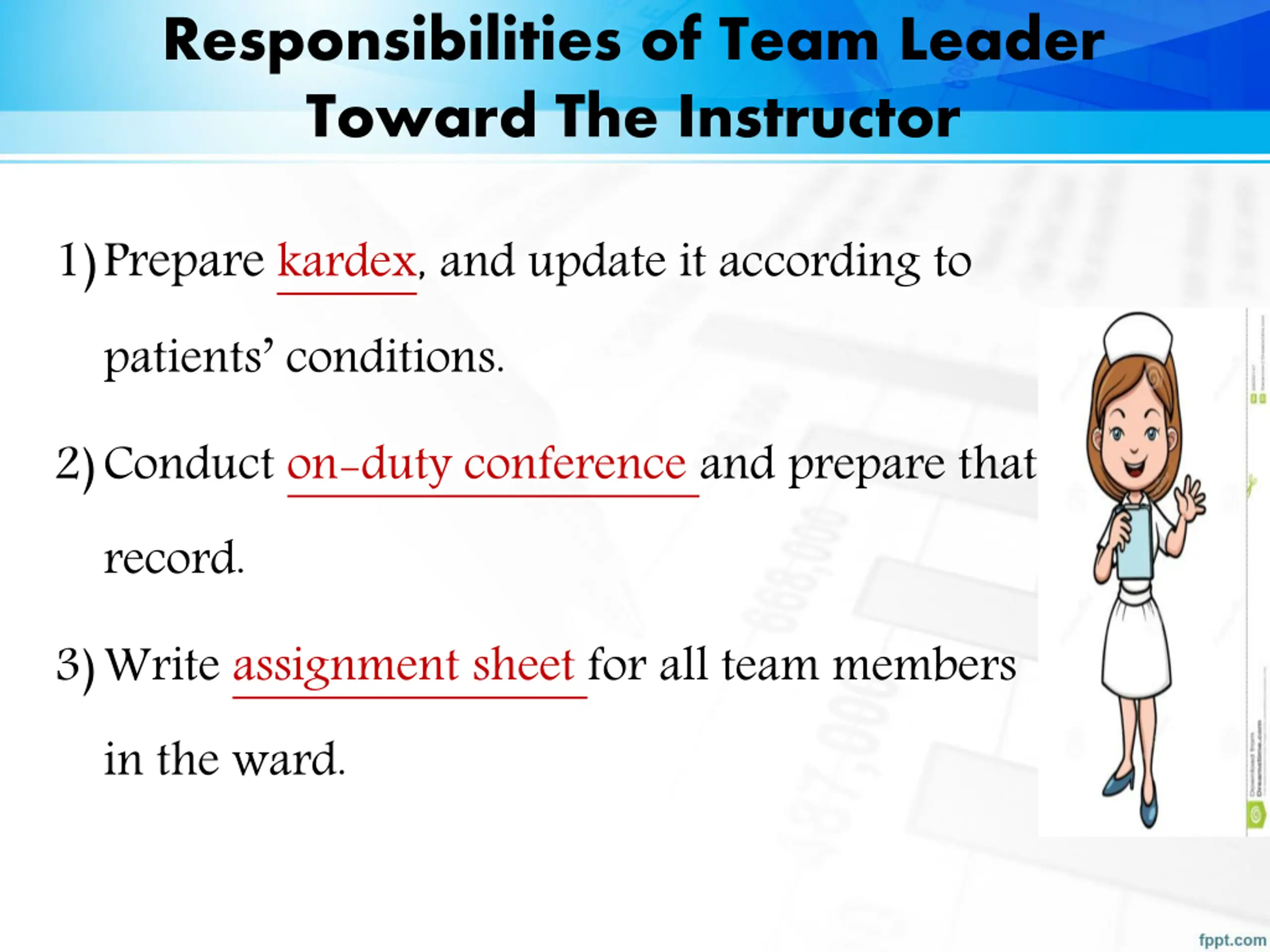 Responsibilities of Team Leader Toward The Instructor 1)Prepare kardex, and update it according to patients conditions. 2)Conduct on-duty conference and prepare that record. 3)Write assignment sheet for all team members in the ward.