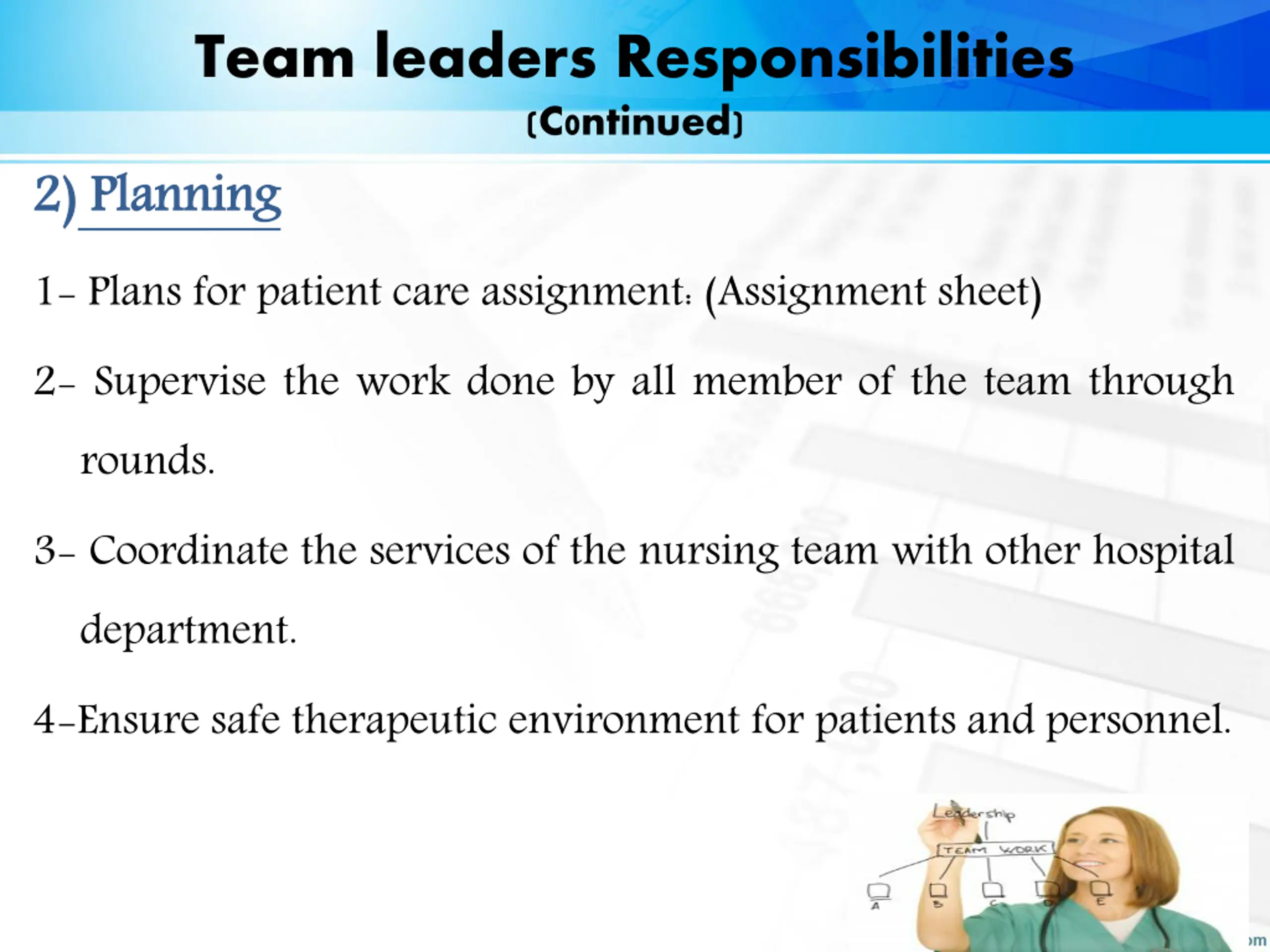 Team leaders Responsibilities (C0ntinued) 2) 2) Planning Planning 1- Plans for patient care assignment: (Assignment sheet) 2- Supervise the work done by all member of the team through rounds. 3- Coordinate the services of the nursing team with other hospital department. 4-Ensure safe therapeutic environment for patients and personnel.