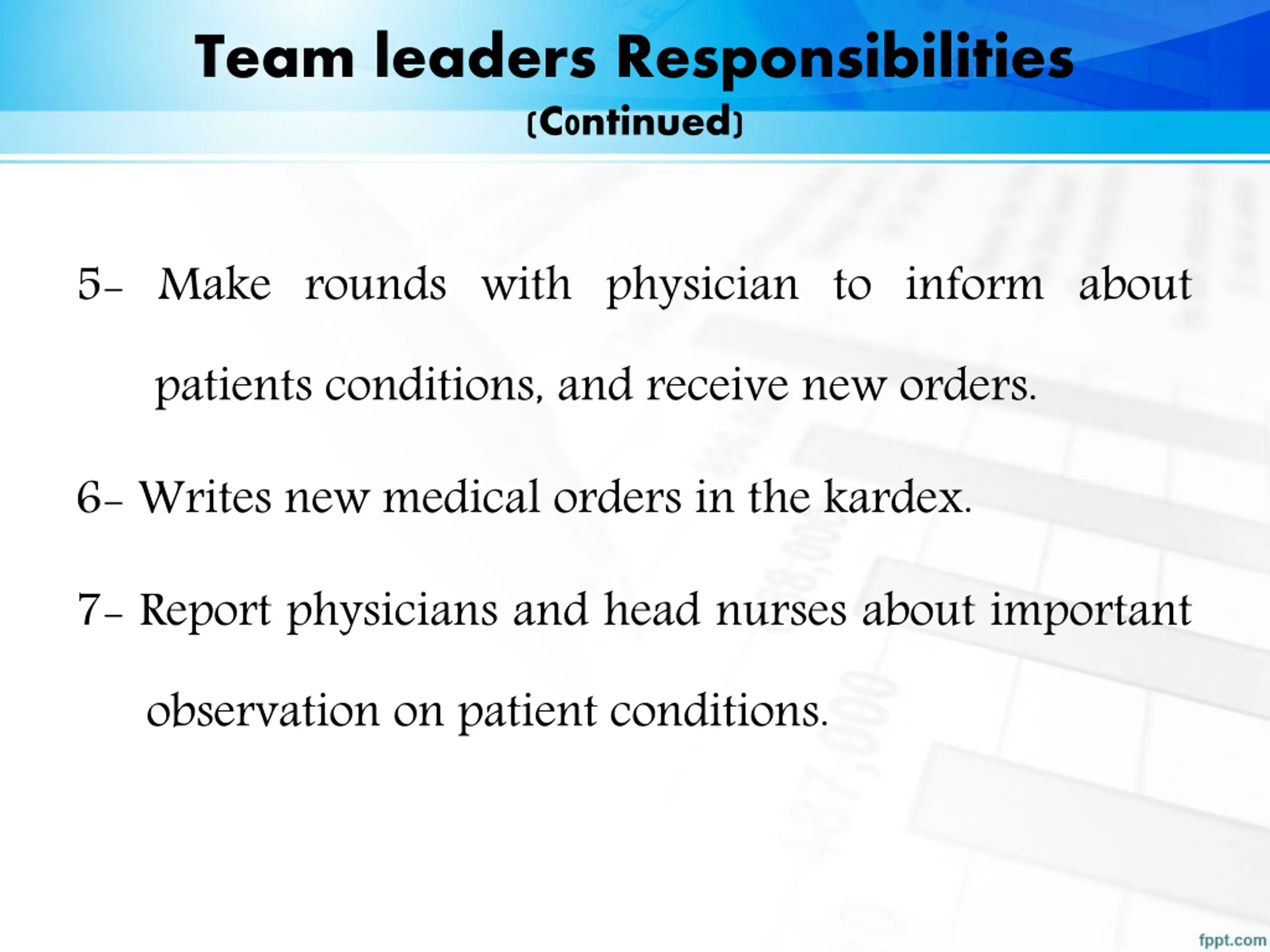 Team leaders Responsibilities (C0ntinued) 5- Make rounds with physician to inform about patients conditions, and receive new orders. 6- Writes new medical orders in the kardex. 7- Report physicians and head nurses about important observation on patient conditions.