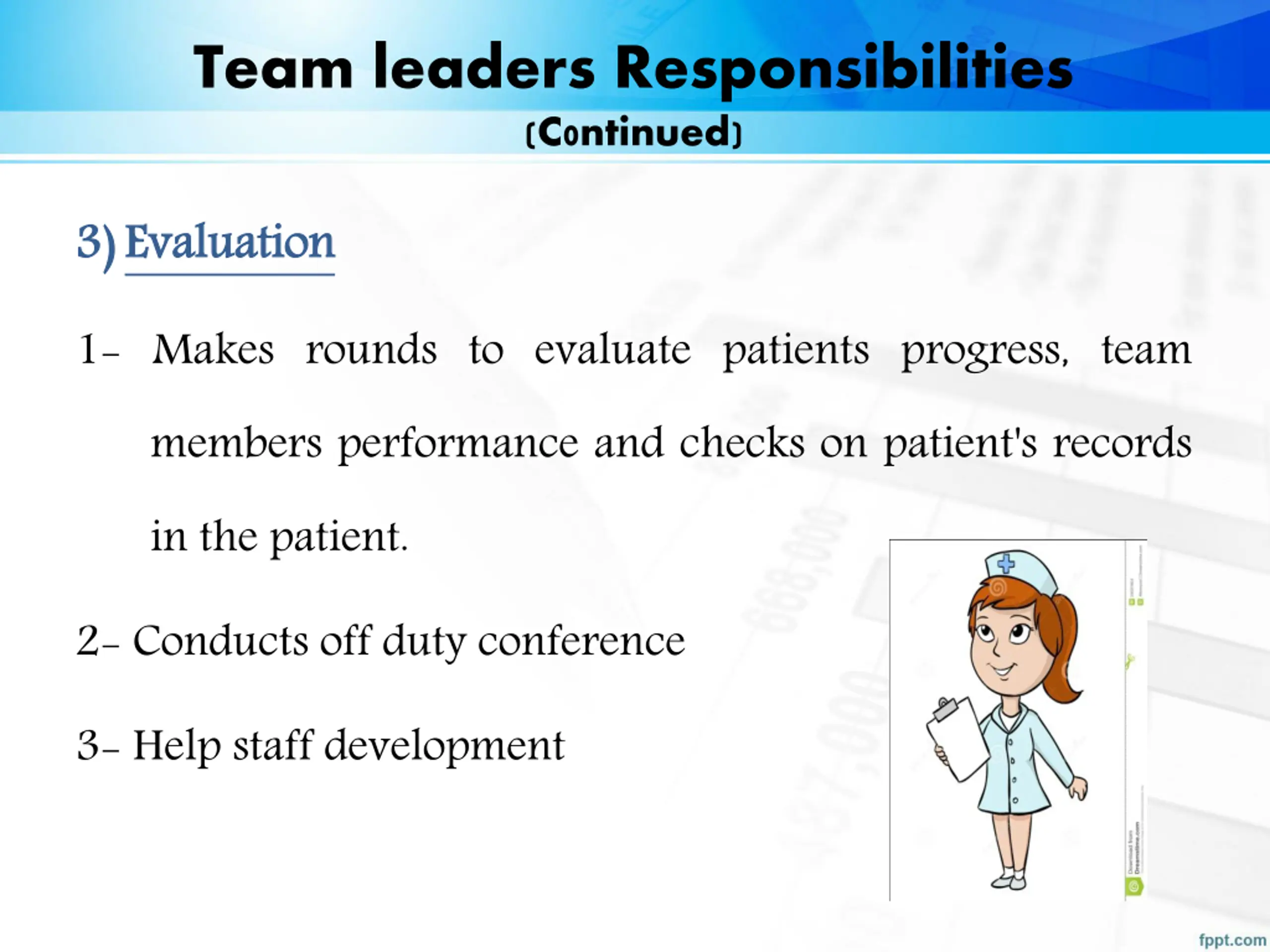 Team leaders Responsibilities (C0ntinued) 3) 3)Evaluation Evaluation 1- Makes rounds to evaluate patients progress, team members performance and checks on patient's records in the patient. 2- Conducts off duty conference 3- Help staff development