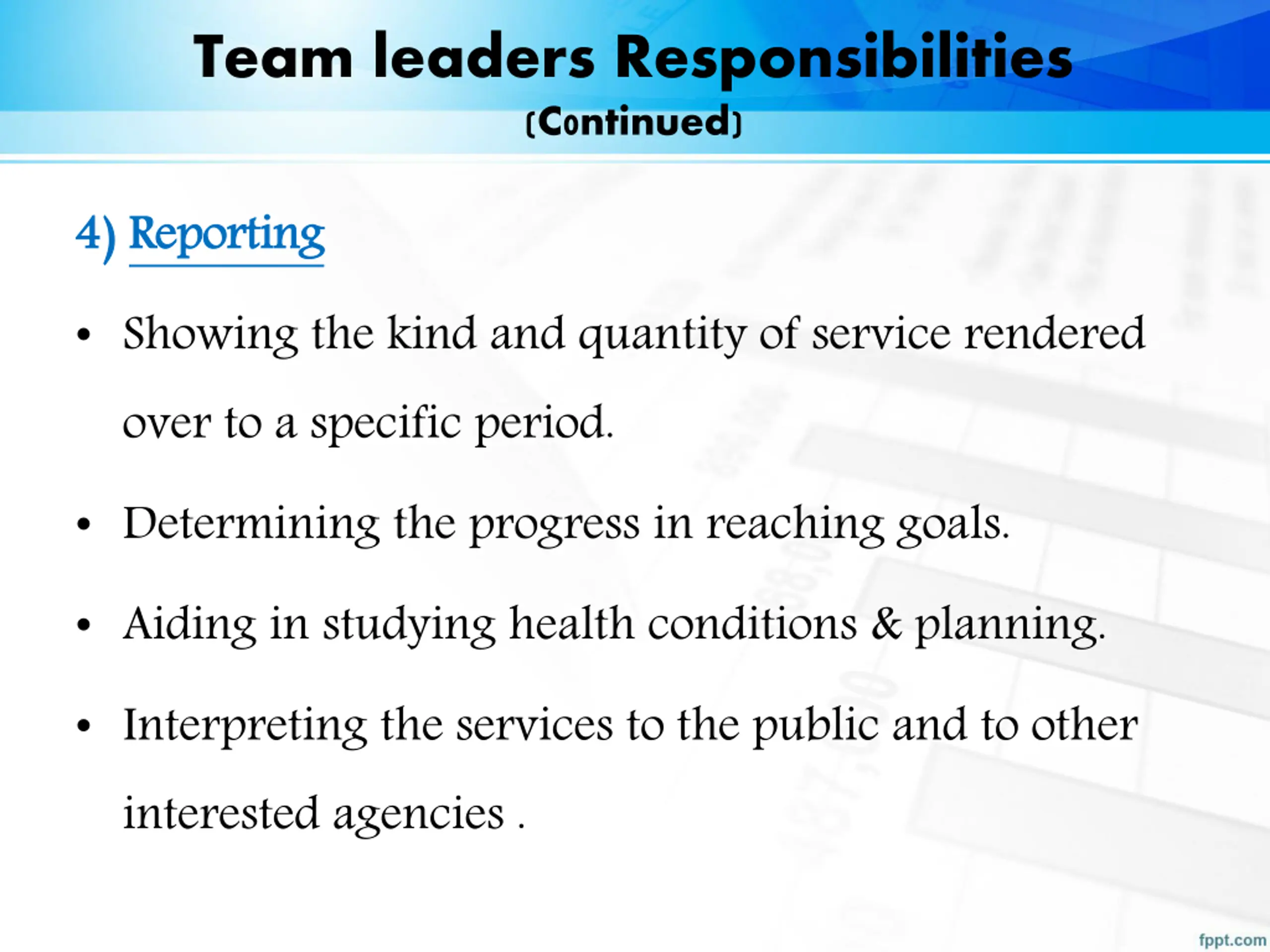 Team leaders Responsibilities (C0ntinued) 4) 4) Reporting Reporting Showing the kind and quantity of service rendered over to a specific period. Determining the progress in reaching goals. Aiding in studying health conditions & planning. Interpreting the services to the public and to other interested agencies .