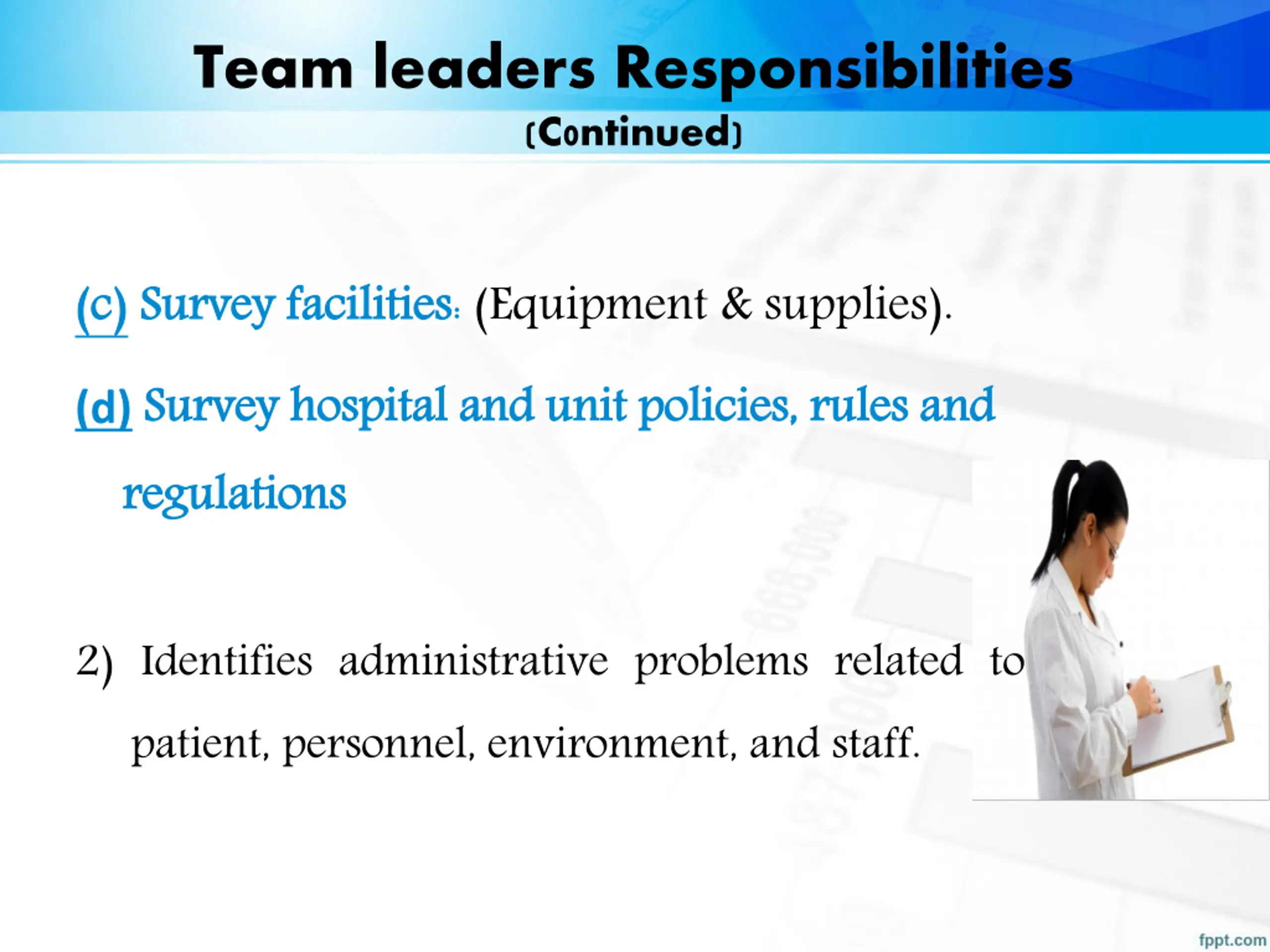 Team leaders Responsibilities (C0ntinued) (c) (c) Survey facilities Survey facilities: (Equipment & supplies). (d)Survey hospital and unit policies, rules and regulations Survey hospital and unit policies, rules and regulations 2) Identifies administrative problems related to patient, personnel, environment, and staff.