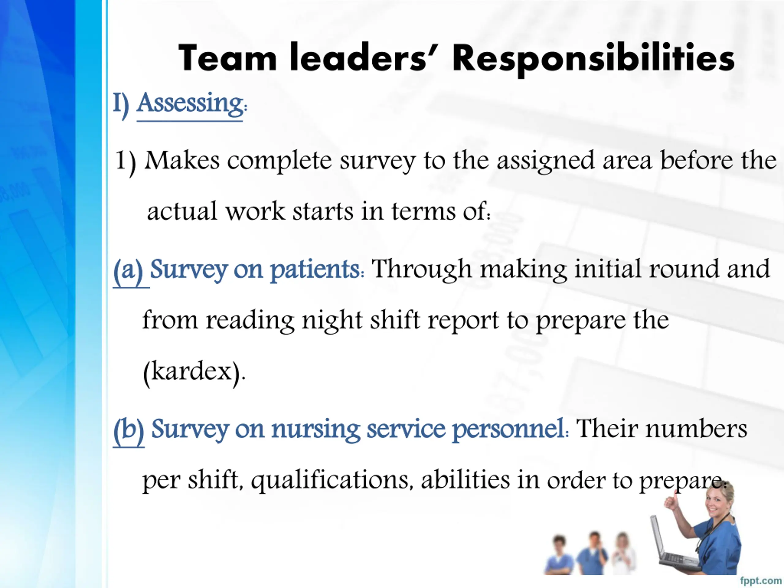 Team leaders Responsibilities I) I) Assessing Assessing: 1) Makes complete survey to the assigned area before the actual work starts in terms of: (a) (a) Survey on patients from reading night shift report to prepare the (kardex). Survey on patients: Through making initial round and (b) (b) Survey on nursing service personnel per shift, qualifications, abilities in order to prepare: Survey on nursing service personnel: Their numbers