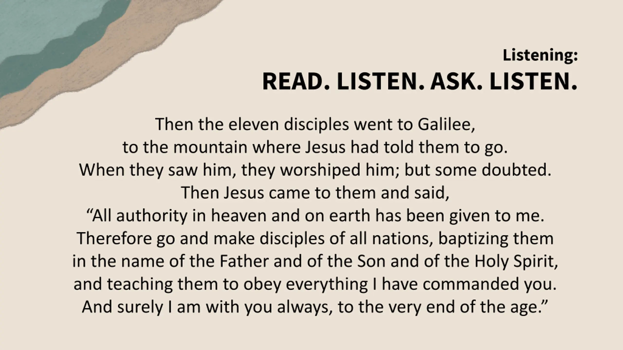 Listening: READ. LISTEN. ASK. LISTEN. Then the eleven disciples went to Galilee, to the mountain where Jesus had told them to go. When they saw him, they worshiped him; but some doubted. Then Jesus came to them and said, All authority in heaven and on earth has been given to me. Therefore go and make disciples of all nations, baptizing them in the name of the Father and of the Son and of the Holy Spirit, and teaching them to obey everything I have commanded you. And surely I am with you always, to the very end of the age.