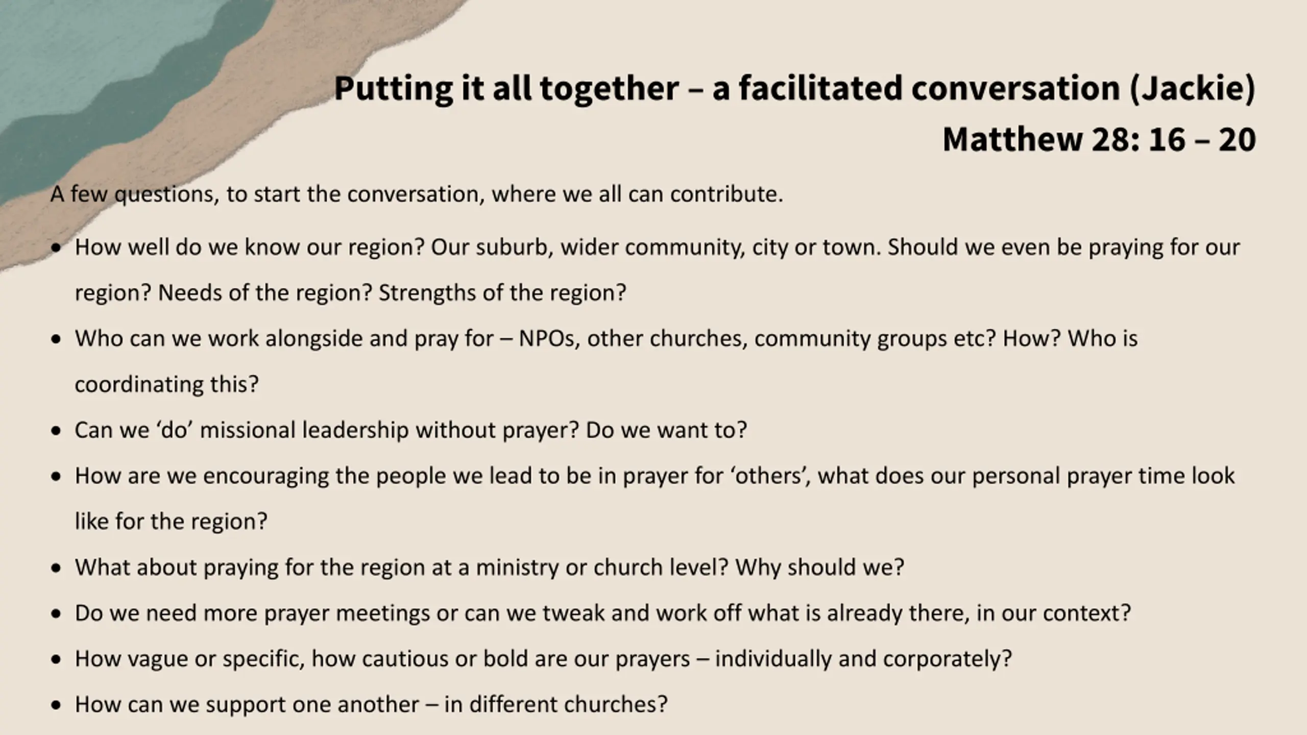 Putting it all together a facilitated conversation (Jackie) Matthew 28: 16 20 A few questions, to start the conversation, where we all can contribute. How well do we know our region? Our suburb, wider community, city or town. Should we even be praying for our region? Needs of the region? Strengths of the region? Who can we work alongside and pray for NPOs, other churches, community groups etc? How? Who is coordinating this? Can we do missional leadership without prayer? Do we want to? How are we encouraging the people we lead to be in prayer for others , what does our personal prayer time look like for the region? What about praying for the region at a ministry or church level? Why should we? Do we need more prayer meetings or can we tweak and work off what is already there, in our context? How vague or specific, how cautious or bold are our prayers individually and corporately? How can we support one another in different churches?