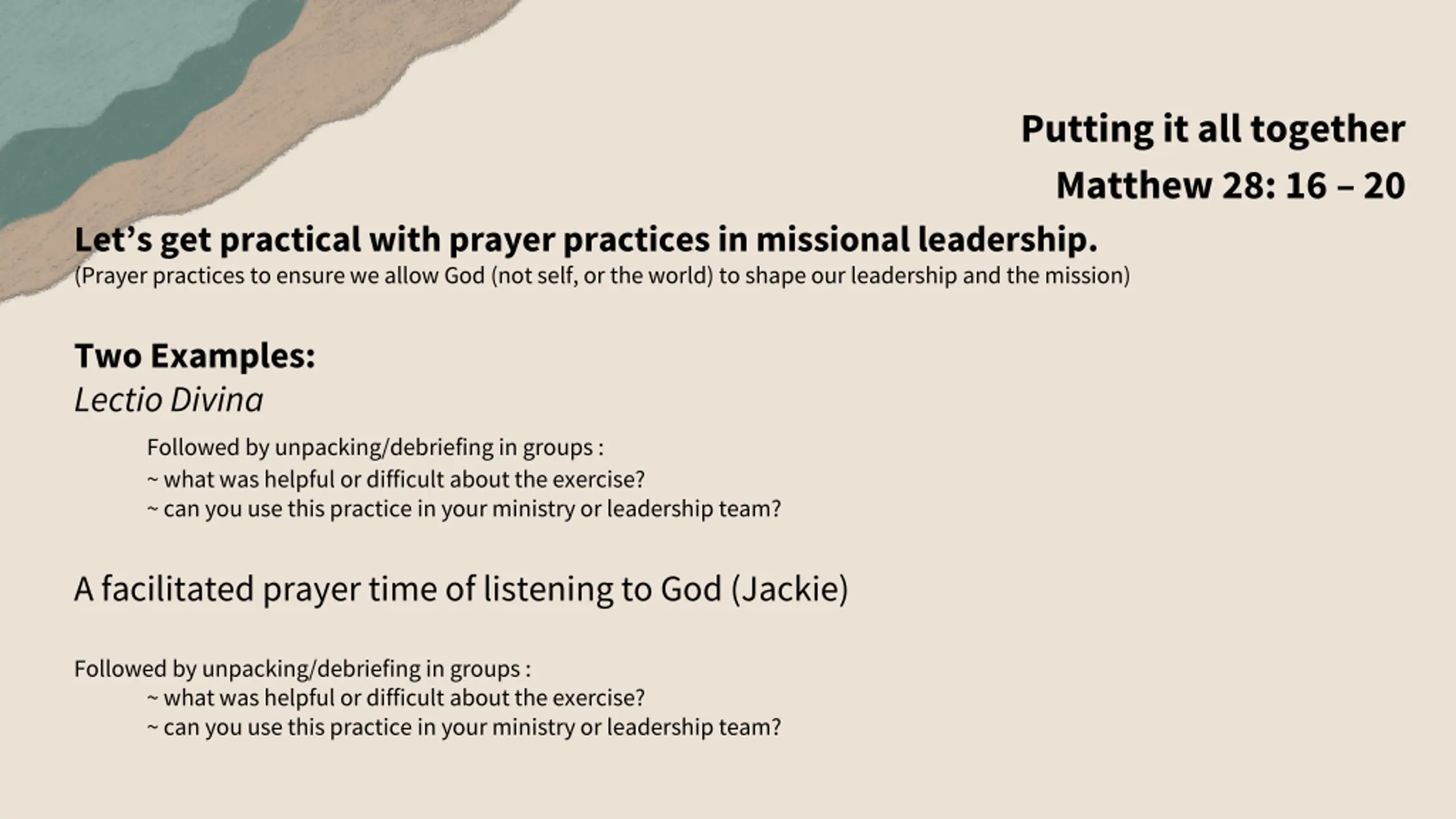 Putting it all together a facilitated conversation (Jackie) Matthew 28: 16 20 Missional Leadership and its practical, day-to-day outworking is to be soaked in prayer.