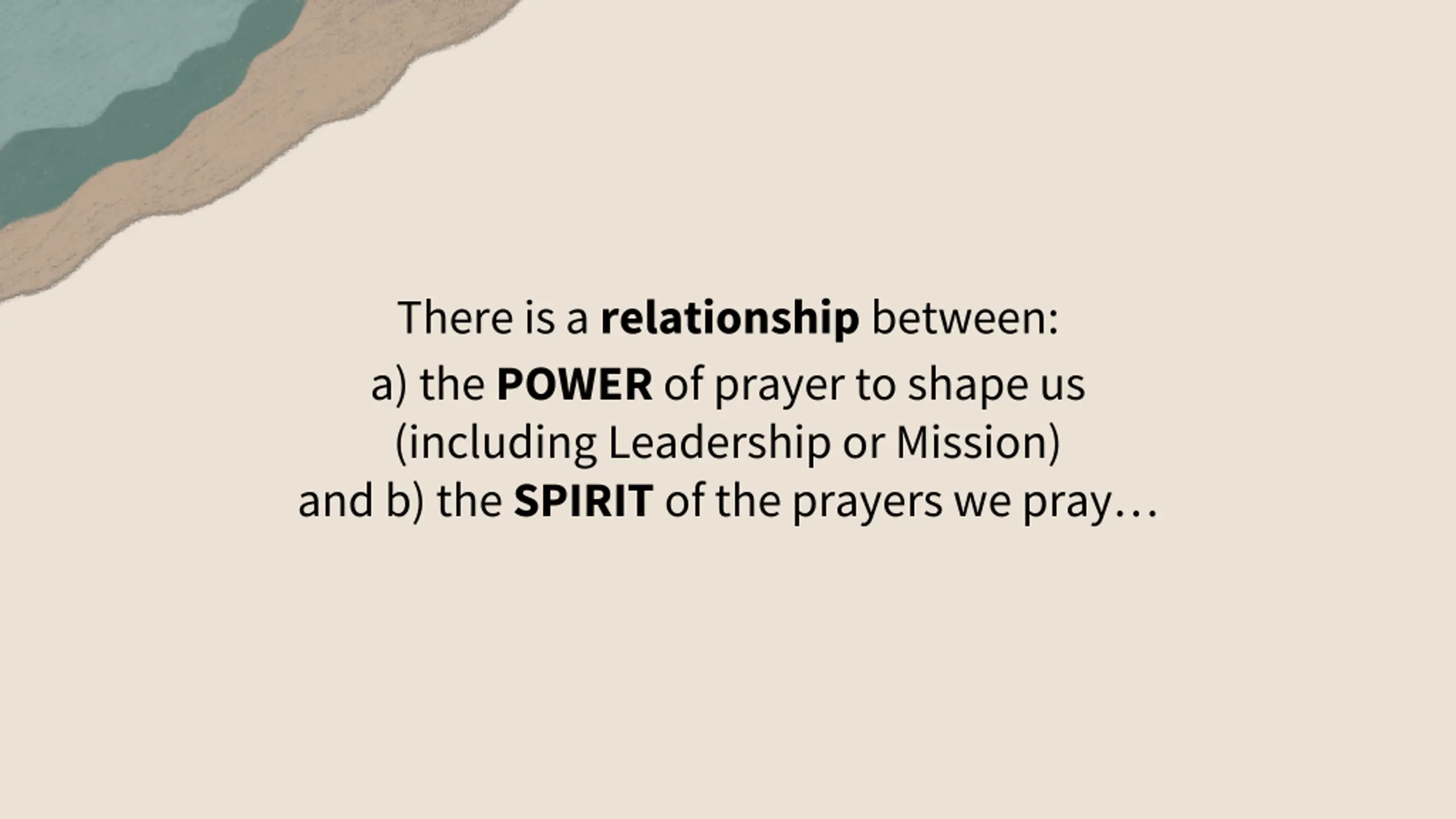 There is a relationship between: a) the POWER of prayer to shape us (including Leadership or Mission) and b) the SPIRITof the prayers we pray