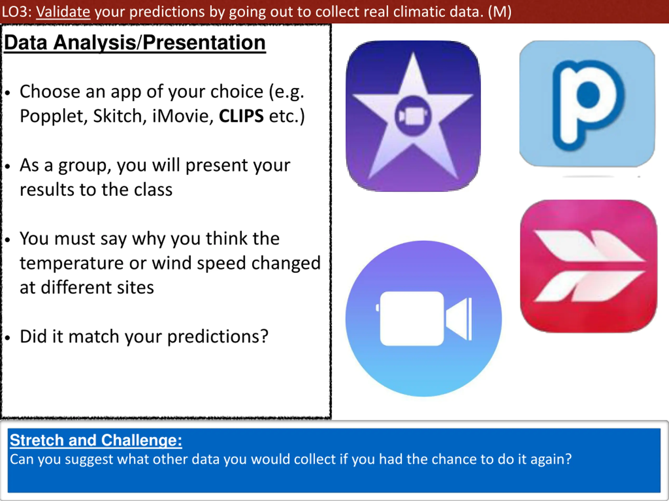 LO3: Validate your predictions by going out to collect real climatic data. (M) Data Analysis/Presentation Choose an app of your choice (e.g. Popplet, Skitch, iMovie, CLIPS etc.) As a group, you will present your results to the class You must say why you think the temperature or wind speed changed at different sites Did it match your predictions? Stretch and Challenge: Can you suggest what other data you would collect if you had the chance to do it again?