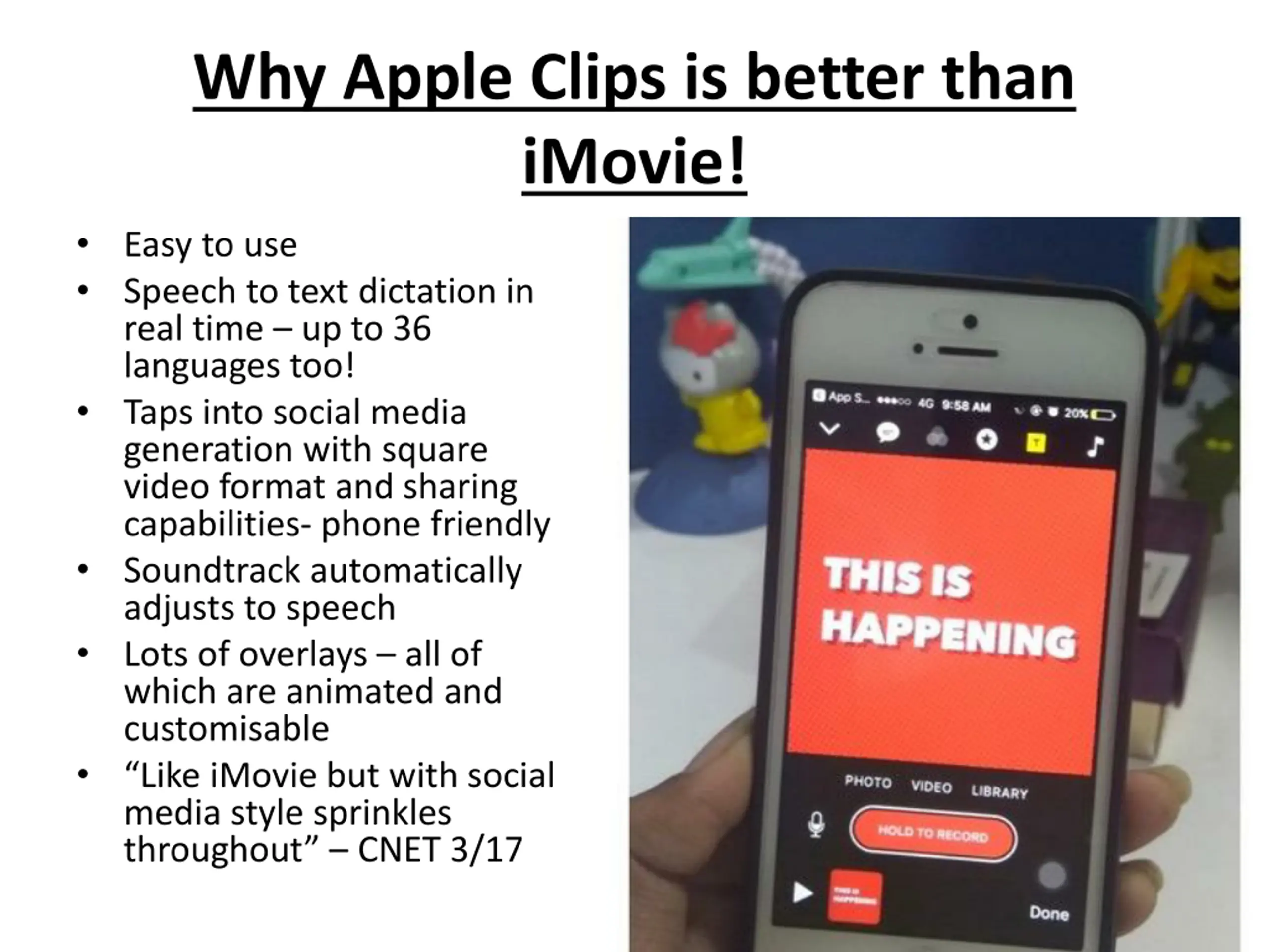 Why Apple Clips is better than iMovie! Easy to use Speech to text dictation in real time up to 36 languages too! Taps into social media generation with square video format and sharing capabilities- phone friendly Soundtrack automatically adjusts to speech Lots of overlays all of which are animated and customisable Like iMovie but with social media style sprinkles throughout CNET 3/17