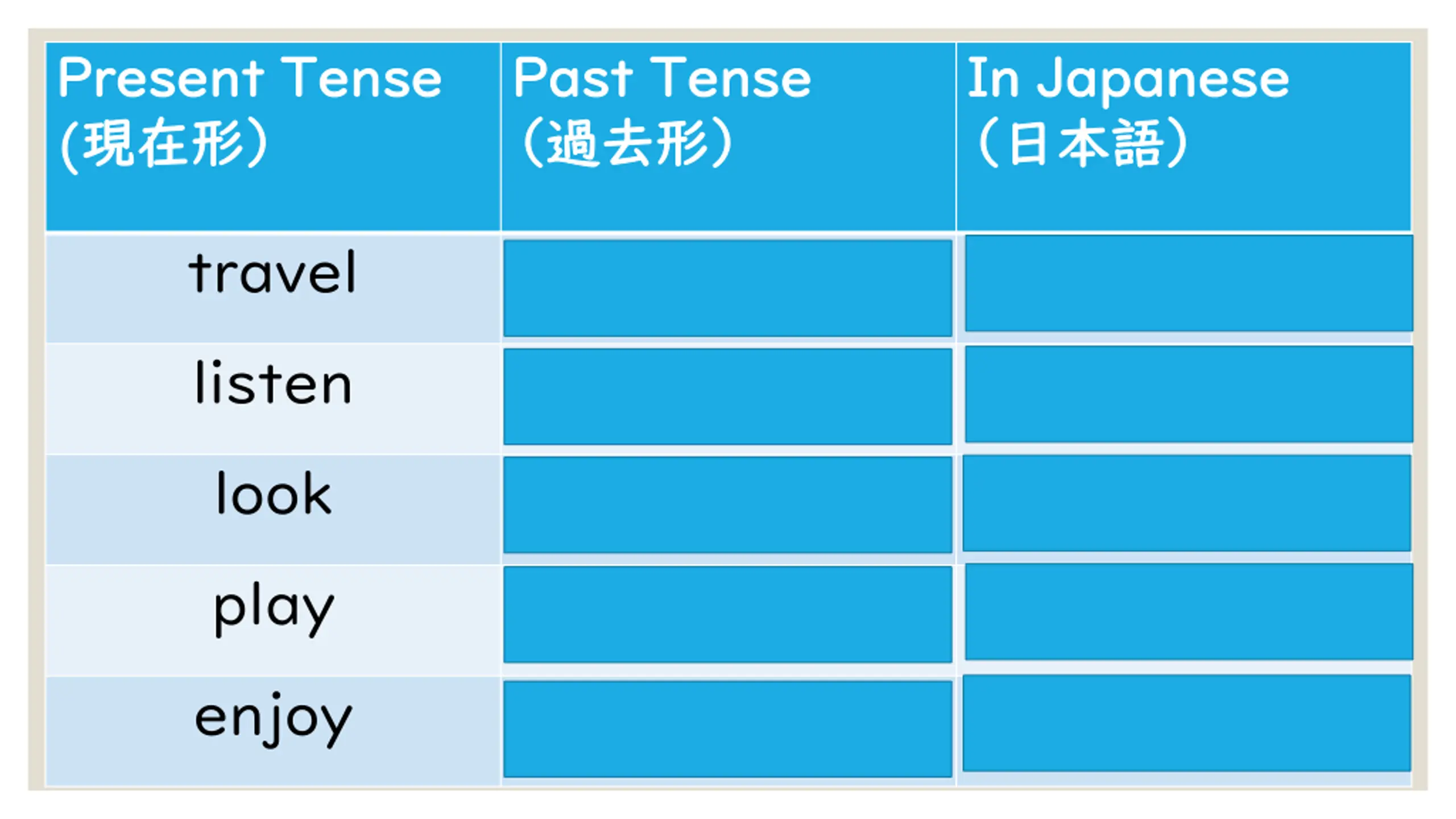 Present Tense Present Tense ( ( Past Tense Past Tense In Japanese In Japanese travel traveled listen listened look looked play played enjoy enjoyed
