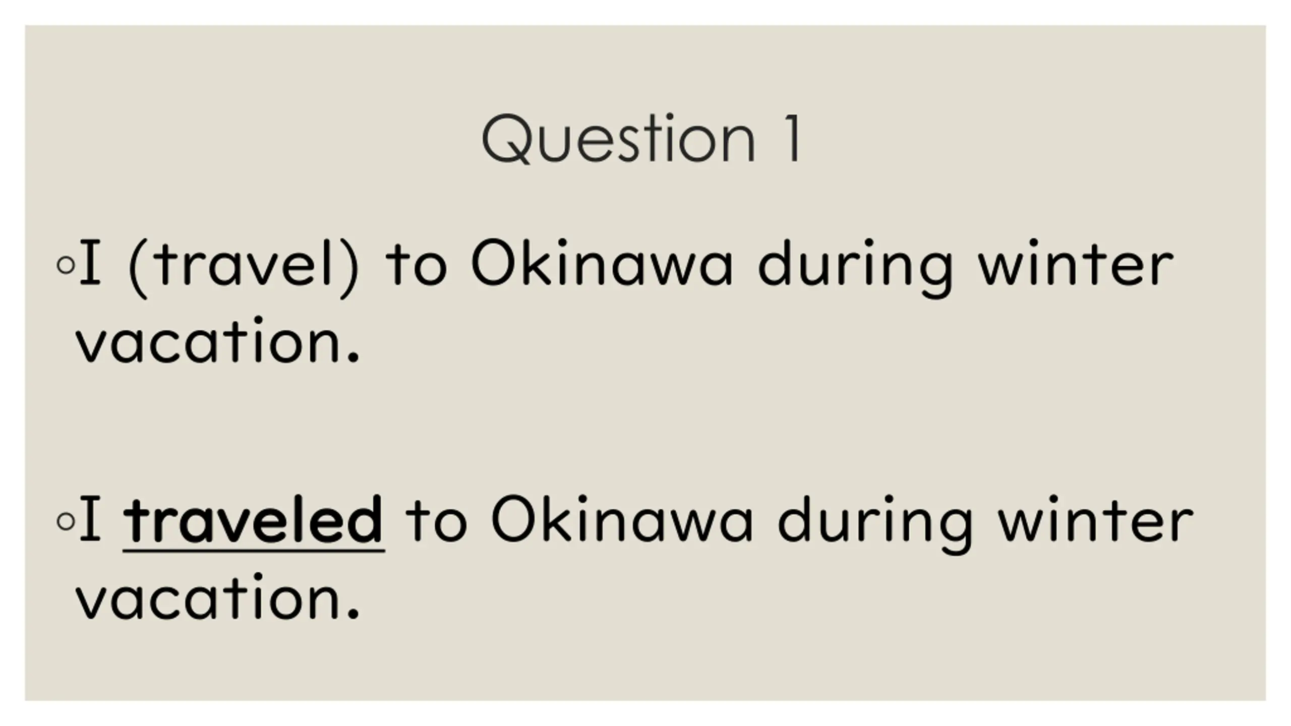 Question 1 I (travel) to Okinawa during winter vacation. I traveled traveled to Okinawa during winter vacation.