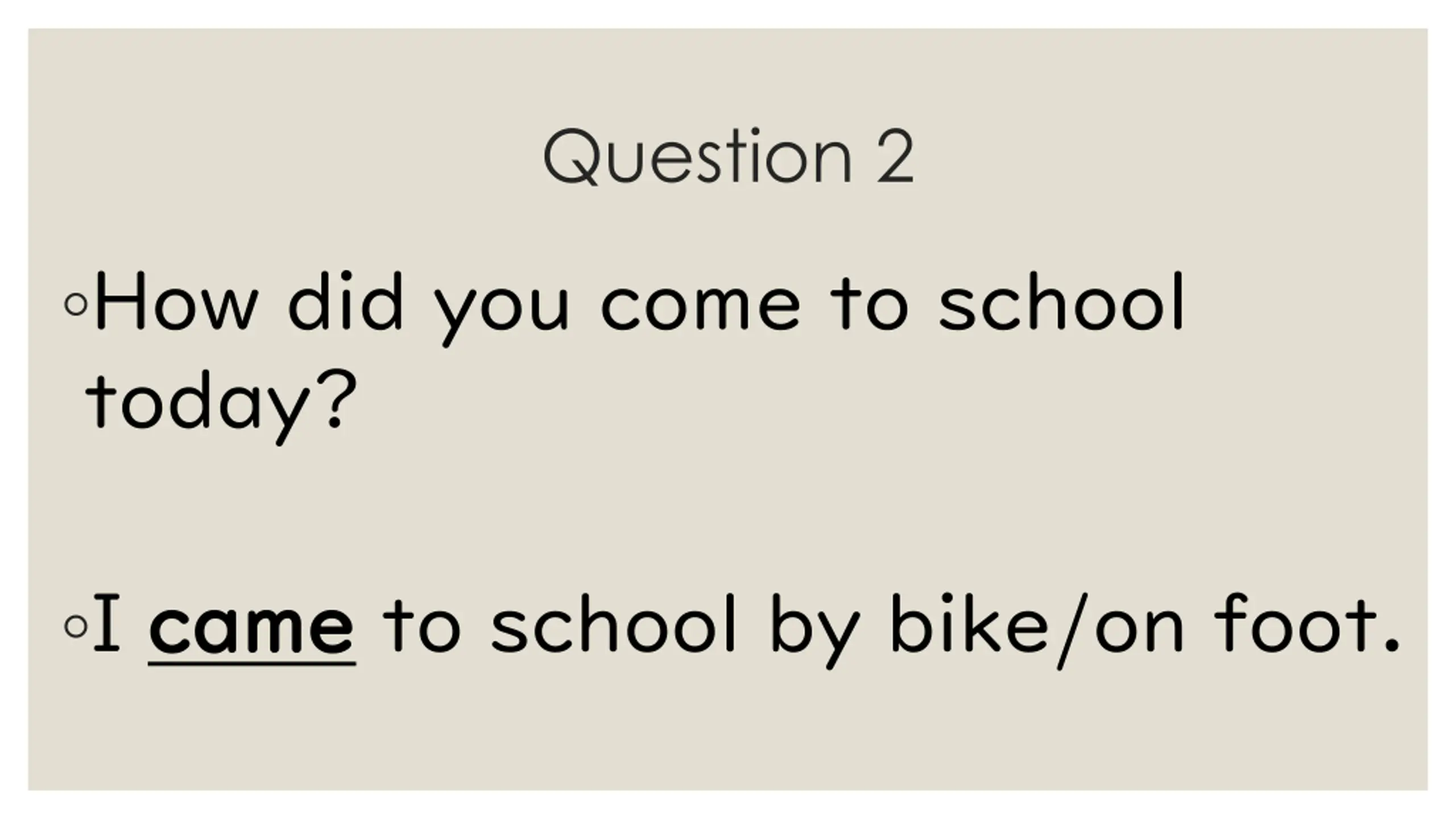 Question 2 How did you come to school today? I came came to school by bike/on foot.
