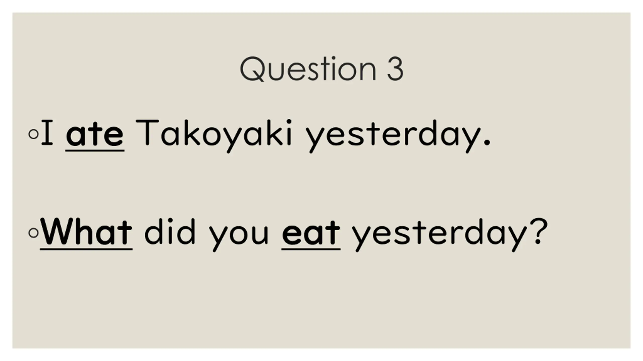 Question 3 I ate ate Takoyaki yesterday. What What did you eat eat yesterday?