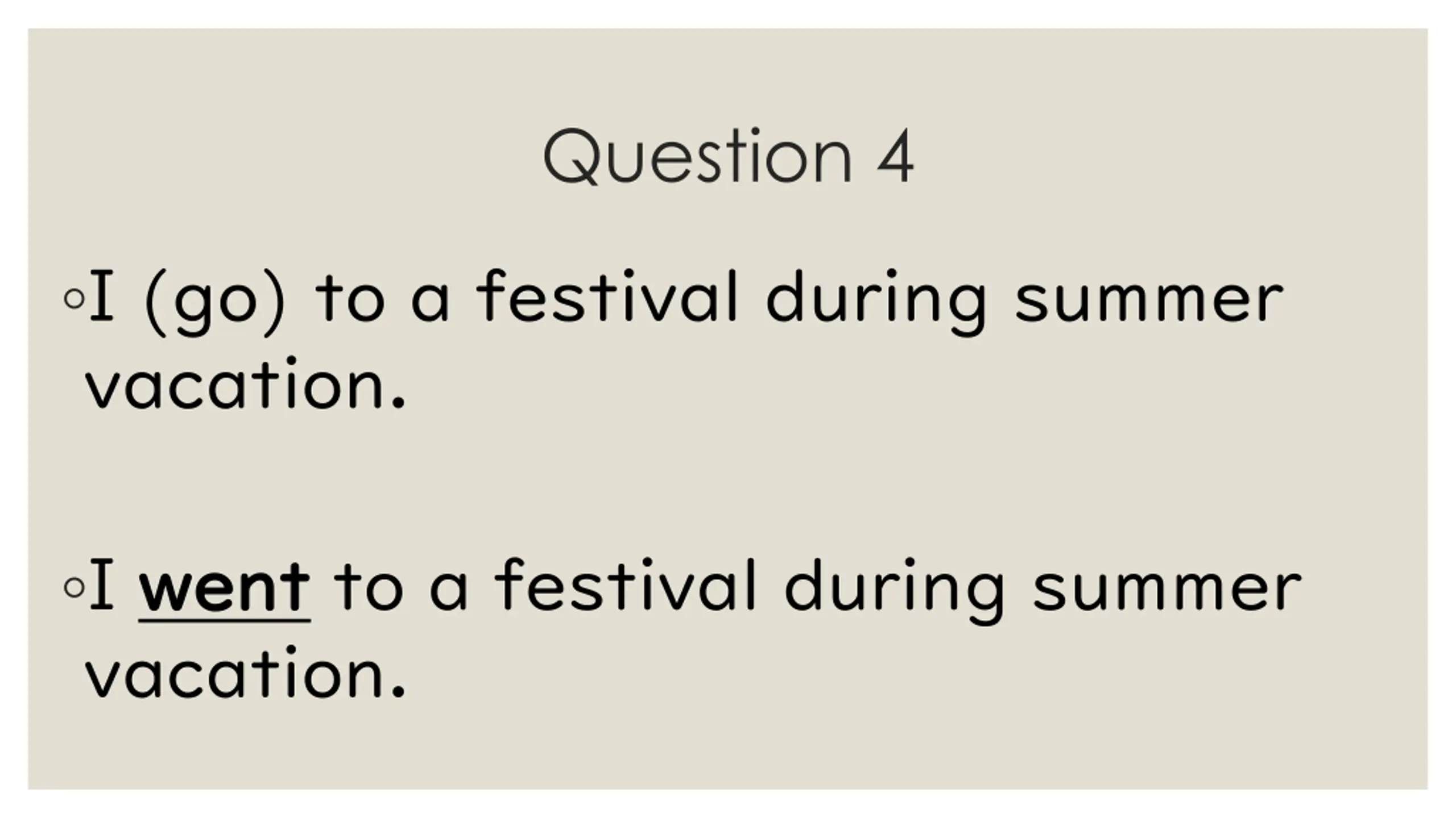Question 4 I (go) to a festival during summer vacation. I went went to a festival during summer vacation.
