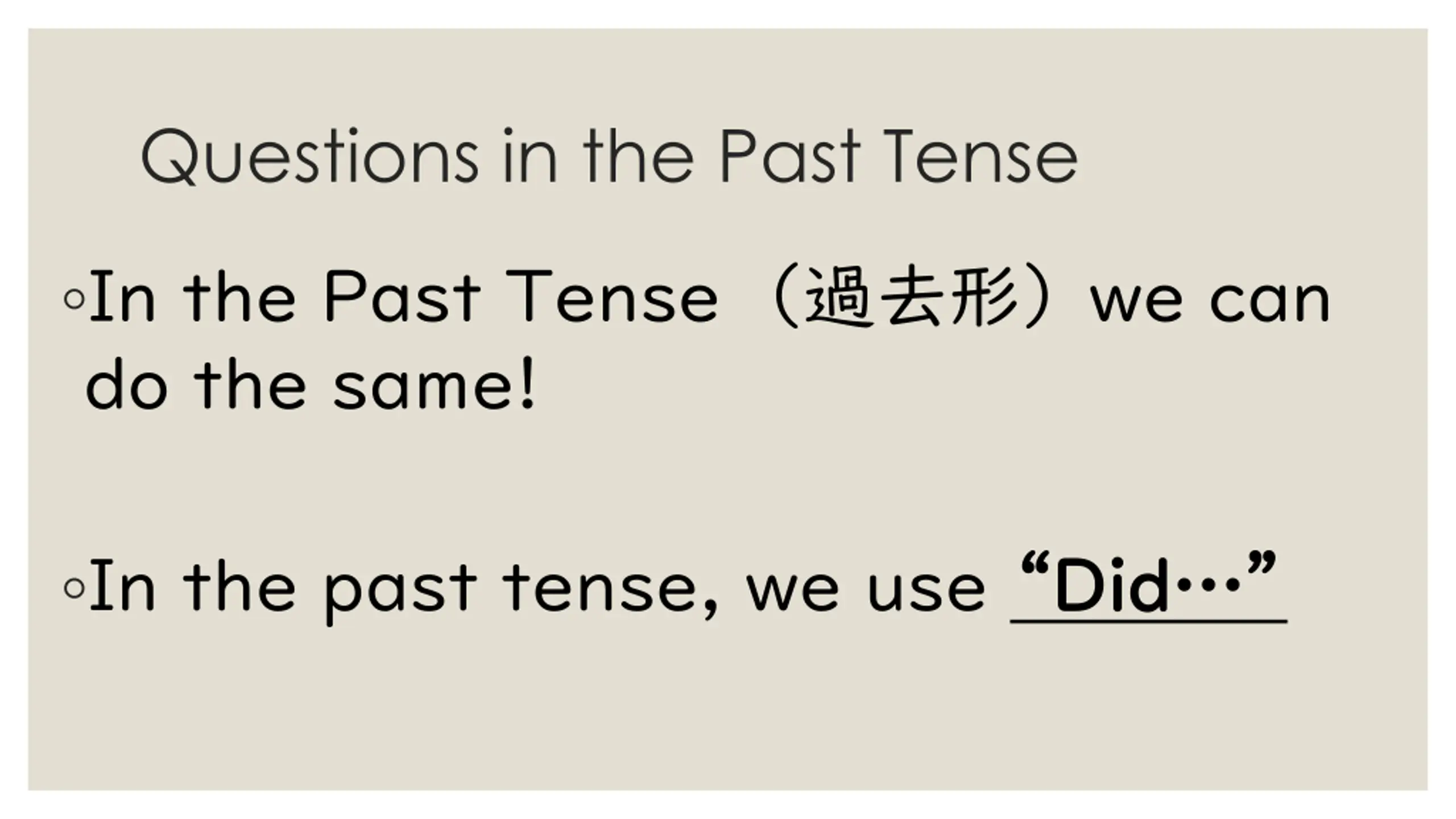 Questions in the Past Tense In the Past Tense we can do the same! In the past tense, we use Did Did