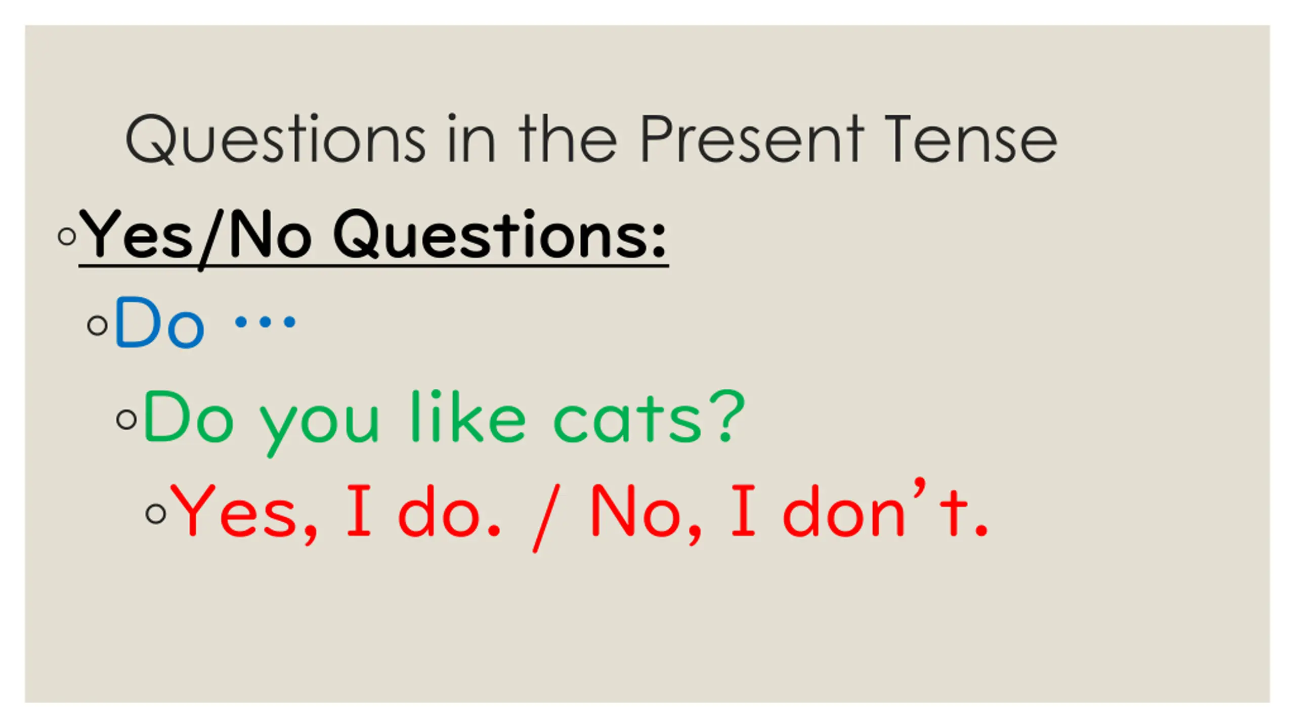 Questions in the Present Tense Yes/No Questions: Yes/No Questions: Do Do you like cats? Yes, I do. / No, I don t.