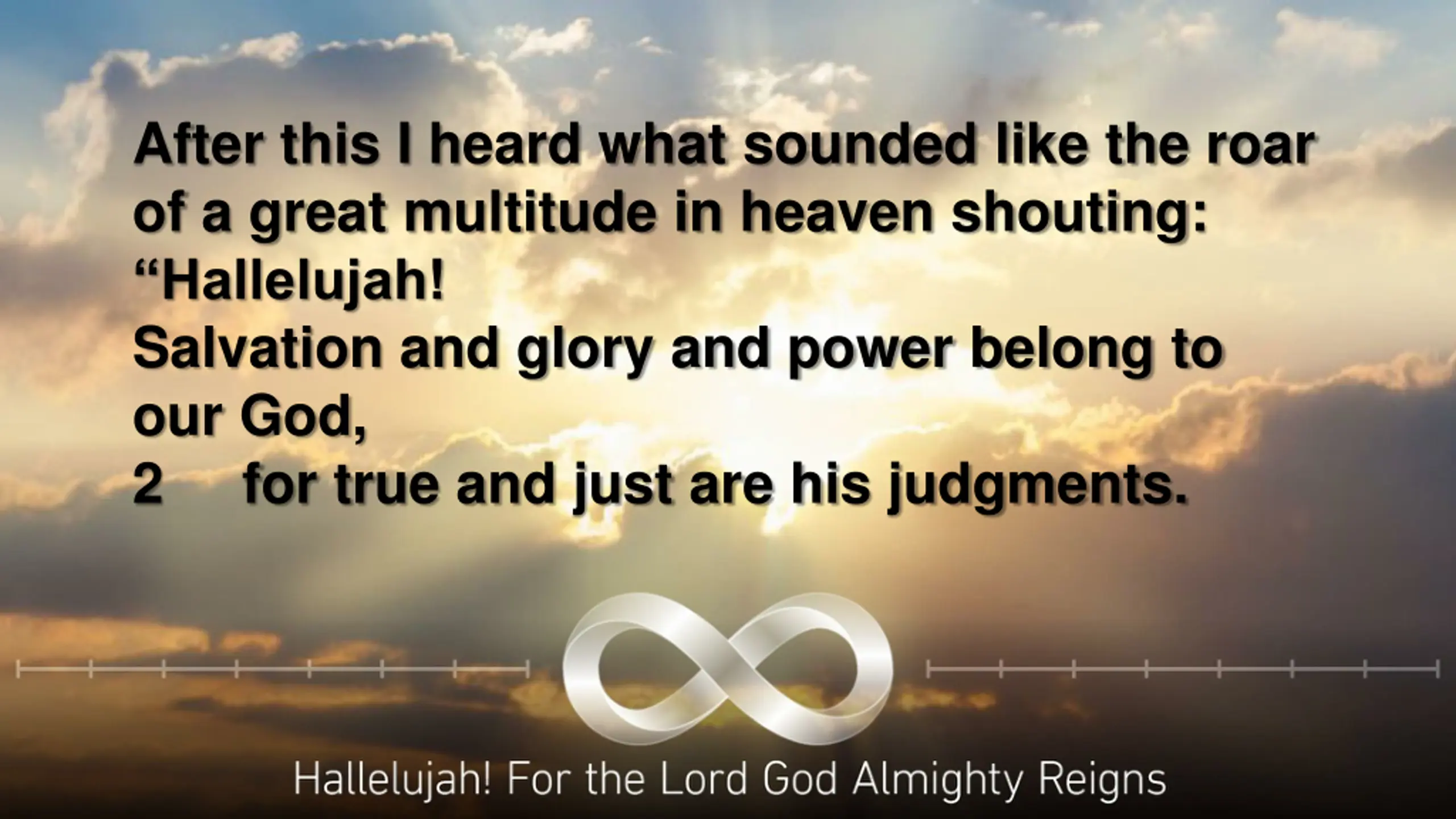 After this I heard what sounded like the roar of a great multitude in heaven shouting: Hallelujah! Salvation and glory and power belong to our God, 2 for true and just are his judgments.