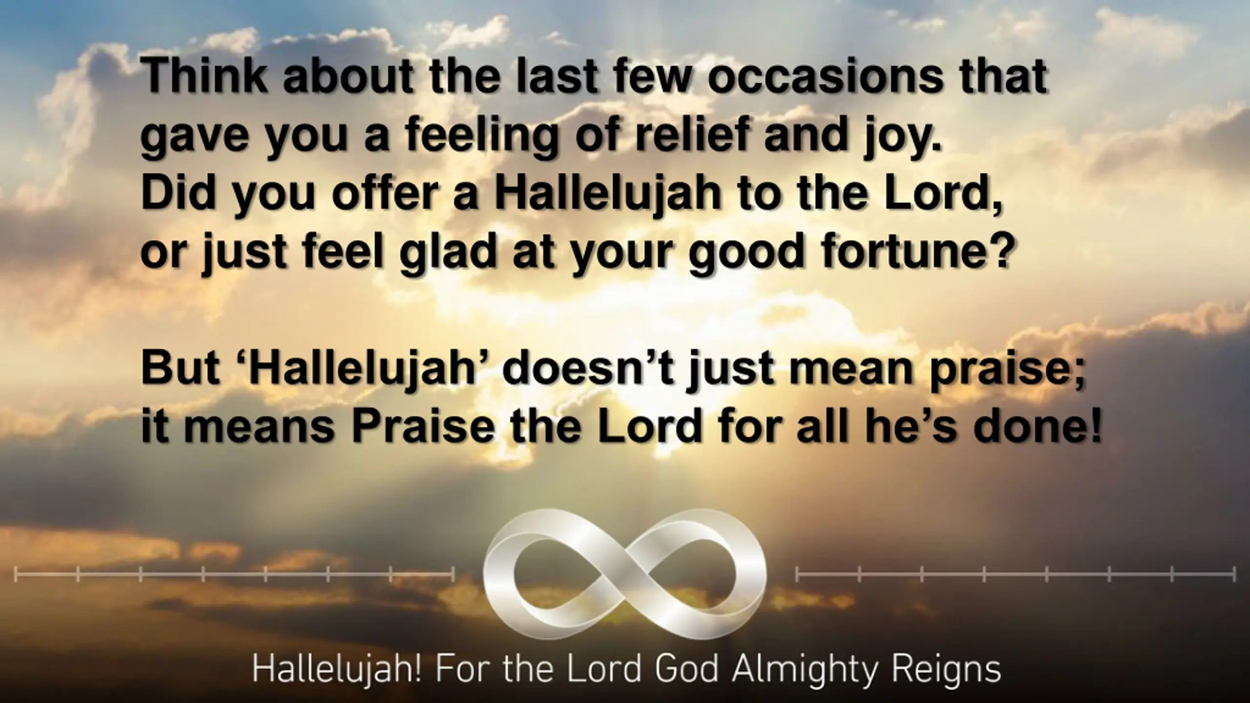 Think about the last few occasions that gave you a feeling of relief and joy. Did you offer a Hallelujah to the Lord, or just feel glad at your good fortune? But Hallelujah doesn t just mean praise; it means Praise the Lord for all he s done!