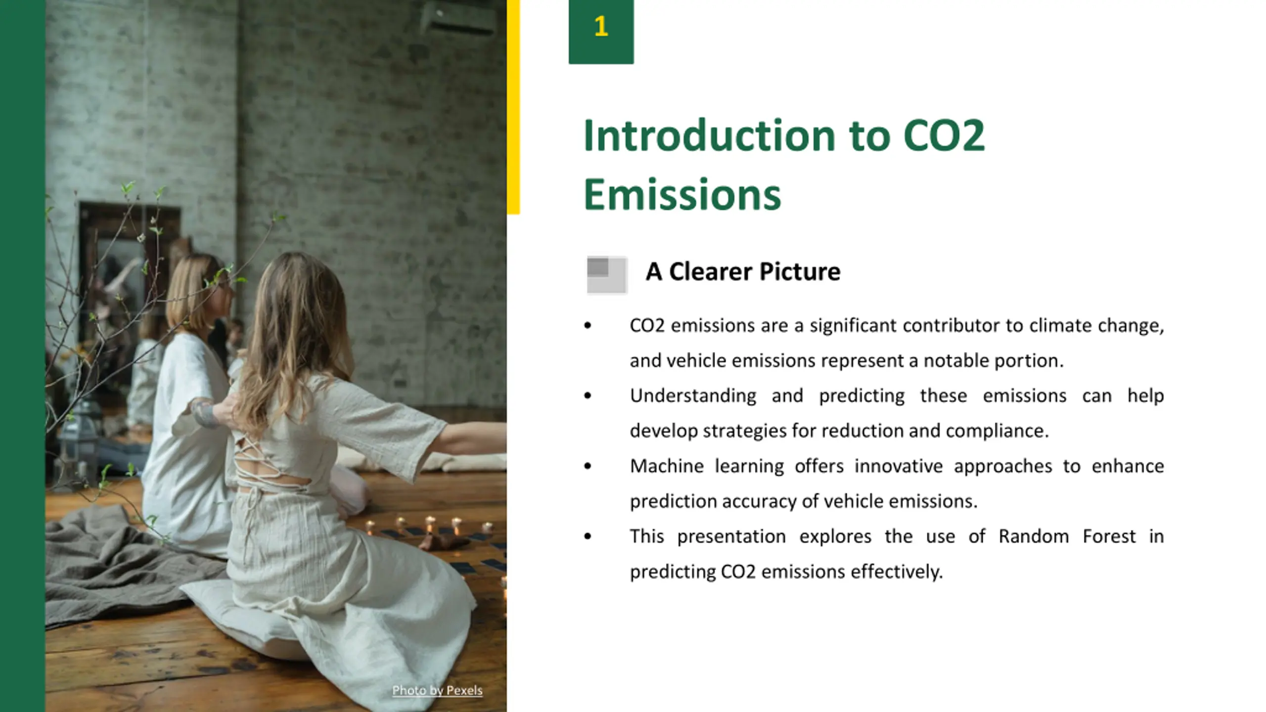 1 Introduction to CO2 Emissions A Clearer Picture CO2 emissions are a significant contributor to climate change, and vehicle emissions represent a notable portion. Understanding and predicting these emissions can help develop strategies for reductionand compliance. Machine learning offers innovative approaches to enhance prediction accuracy of vehicle emissions. This presentation explores the use of Random Forest in predicting CO2 emissions effectively. Photo by Pexels