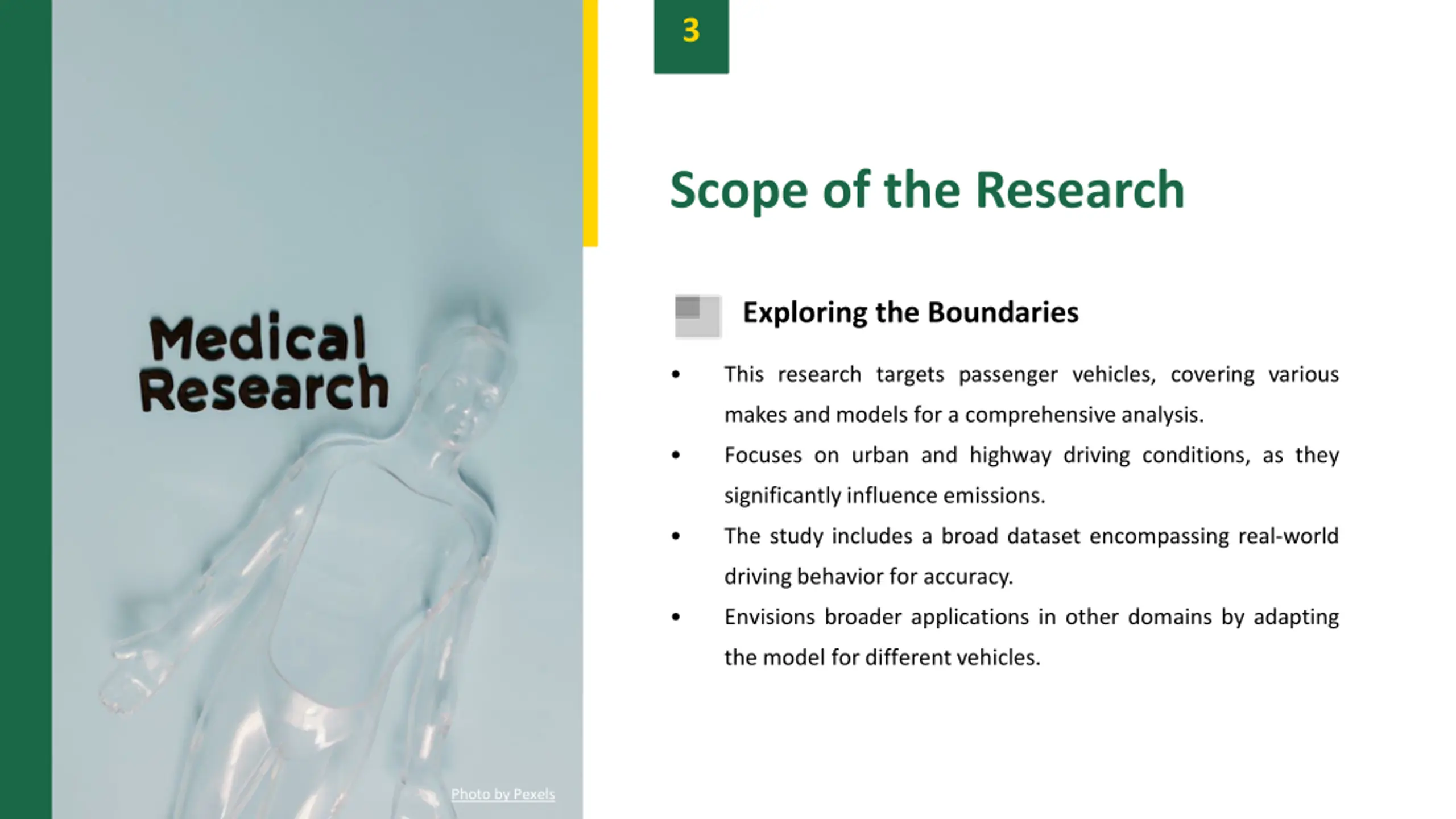 3 Scope of the Research Exploring the Boundaries This research targets passenger vehicles, covering various makes and models for a comprehensive analysis. Focuses on urban and highway driving conditions, as they significantly influence emissions. The study includes a broad dataset encompassing real-world driving behavior for accuracy. Envisions broader applications in other domains by adapting the model for differentvehicles. Photo by Pexels