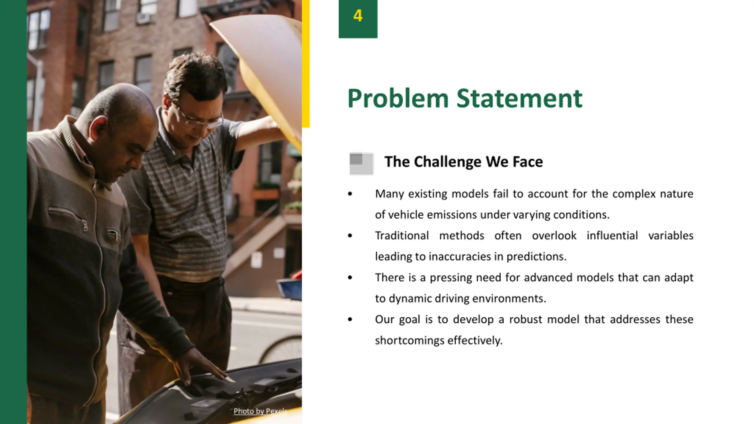 4 Problem Statement The Challenge We Face Many existing models fail to account for the complex nature of vehicle emissions undervarying conditions. Traditional methods often overlook influential variables leading to inaccuracies in predictions. There is a pressing need for advanced models that can adapt to dynamic driving environments. Our goal is to develop a robust model that addresses these shortcomings effectively. Photo by Pexels