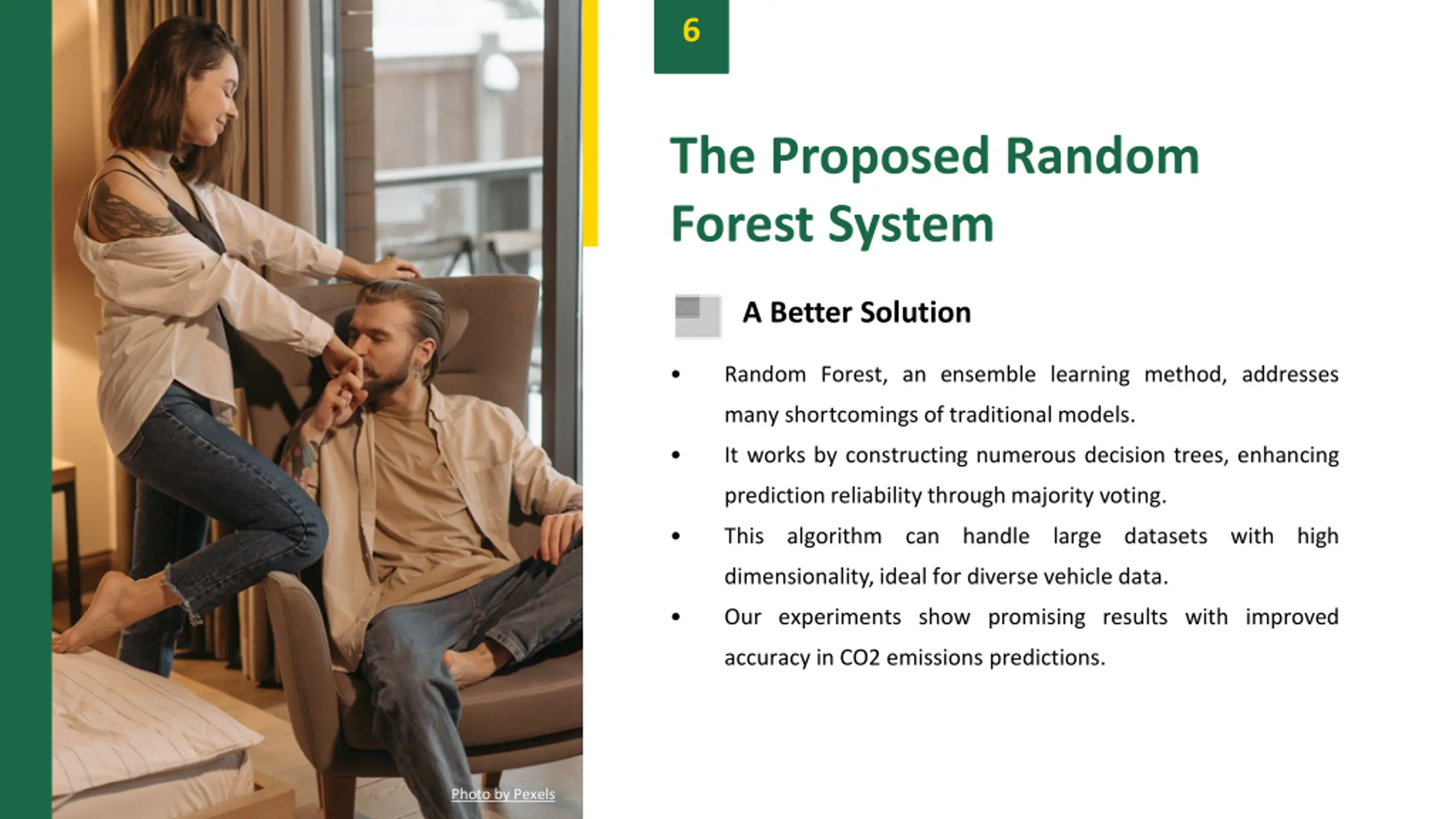 6 The Proposed Random Forest System A Better Solution Random Forest, an ensemble learning method, addresses many shortcomings of traditional models. It works by constructing numerous decision trees, enhancing predictionreliability throughmajority voting. This algorithm can handle large datasets with high dimensionality, ideal for diverse vehicle data. Our experiments show promising results with improved accuracy in CO2 emissions predictions. Photo by Pexels