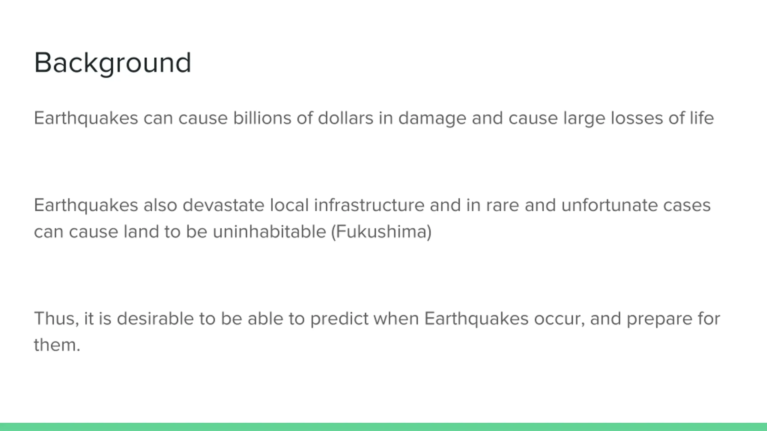 Background Earthquakes can cause billions of dollars in damage and cause large losses of life Earthquakes also devastate local infrastructure and in rare and unfortunate cases can cause land to be uninhabitable (Fukushima) Thus, it is desirable to be able to predict when Earthquakes occur, and prepare for them.