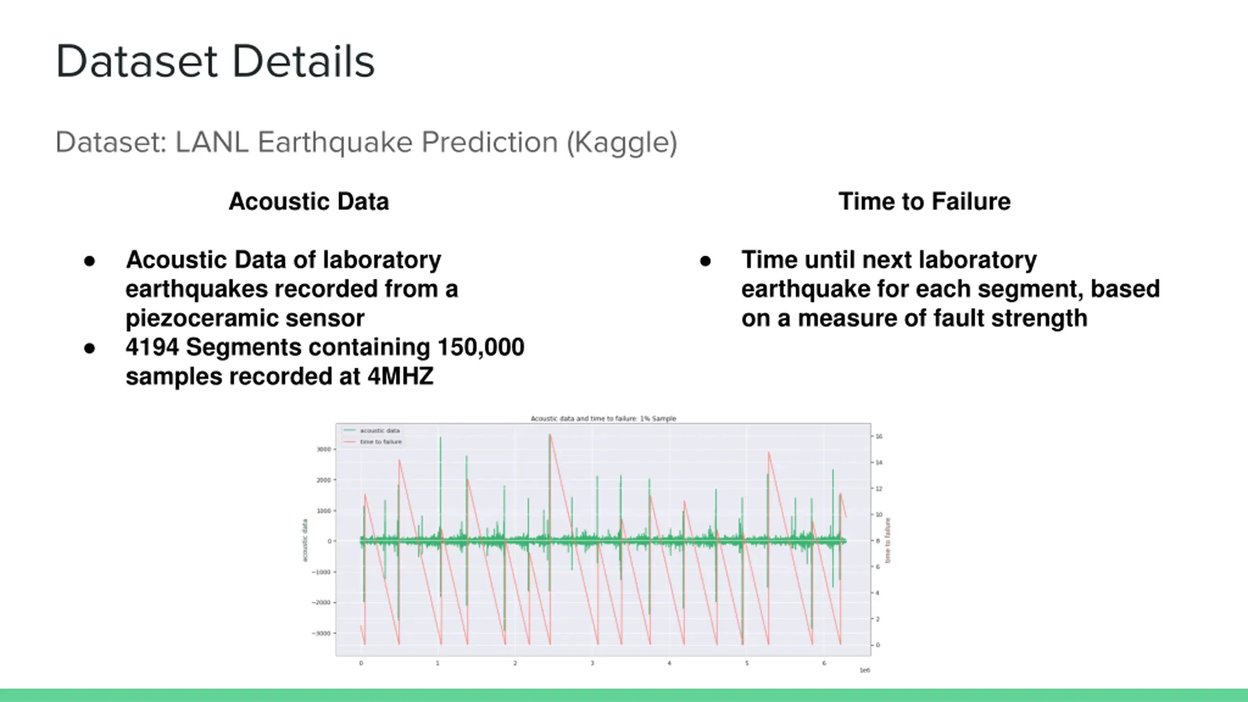 Dataset Details Dataset: LANL Earthquake Prediction (Kaggle) Acoustic Data Time to Failure Acoustic Data of laboratory earthquakes recorded from a piezoceramic sensor 4194 Segments containing 150,000 samples recorded at 4MHZ Time until next laboratory earthquake for each segment, based on a measure of fault strength