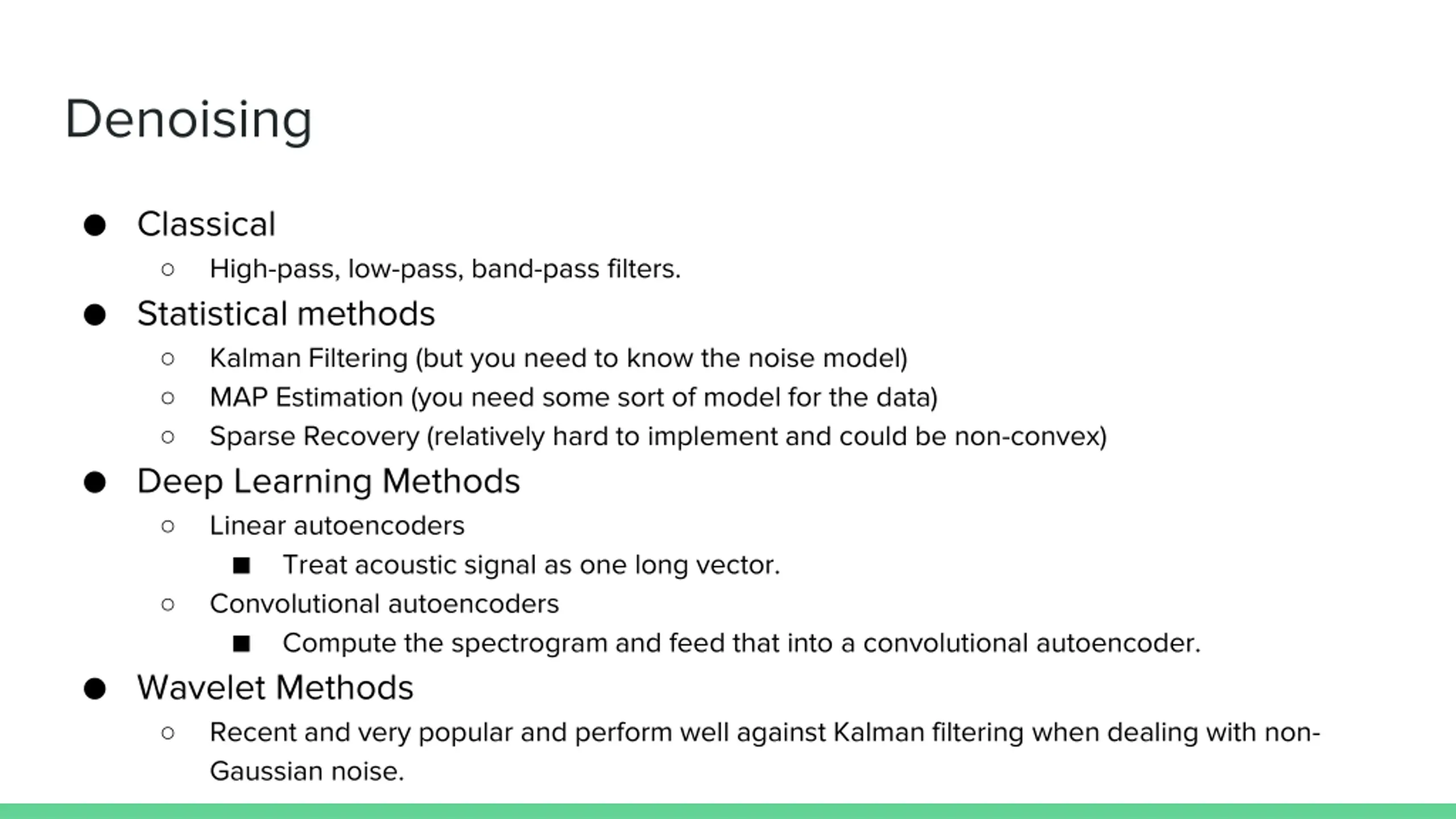 Denoising Classical Statistical methods Kalman Filtering (but you need to know the noise model) MAP Estimation (you need some sort of model for the data) Sparse Recovery (relatively hard to implement and could be non-convex) Deep Learning Methods Linear autoencoders Treat acoustic signal as one long vector. Convolutional autoencoders Compute the spectrogram and feed that into a convolutional autoencoder. Wavelet Methods Recent and very popular and perform well against Kalman filtering when dealing with non- Gaussian noise. High-pass, low-pass, band-pass filters.