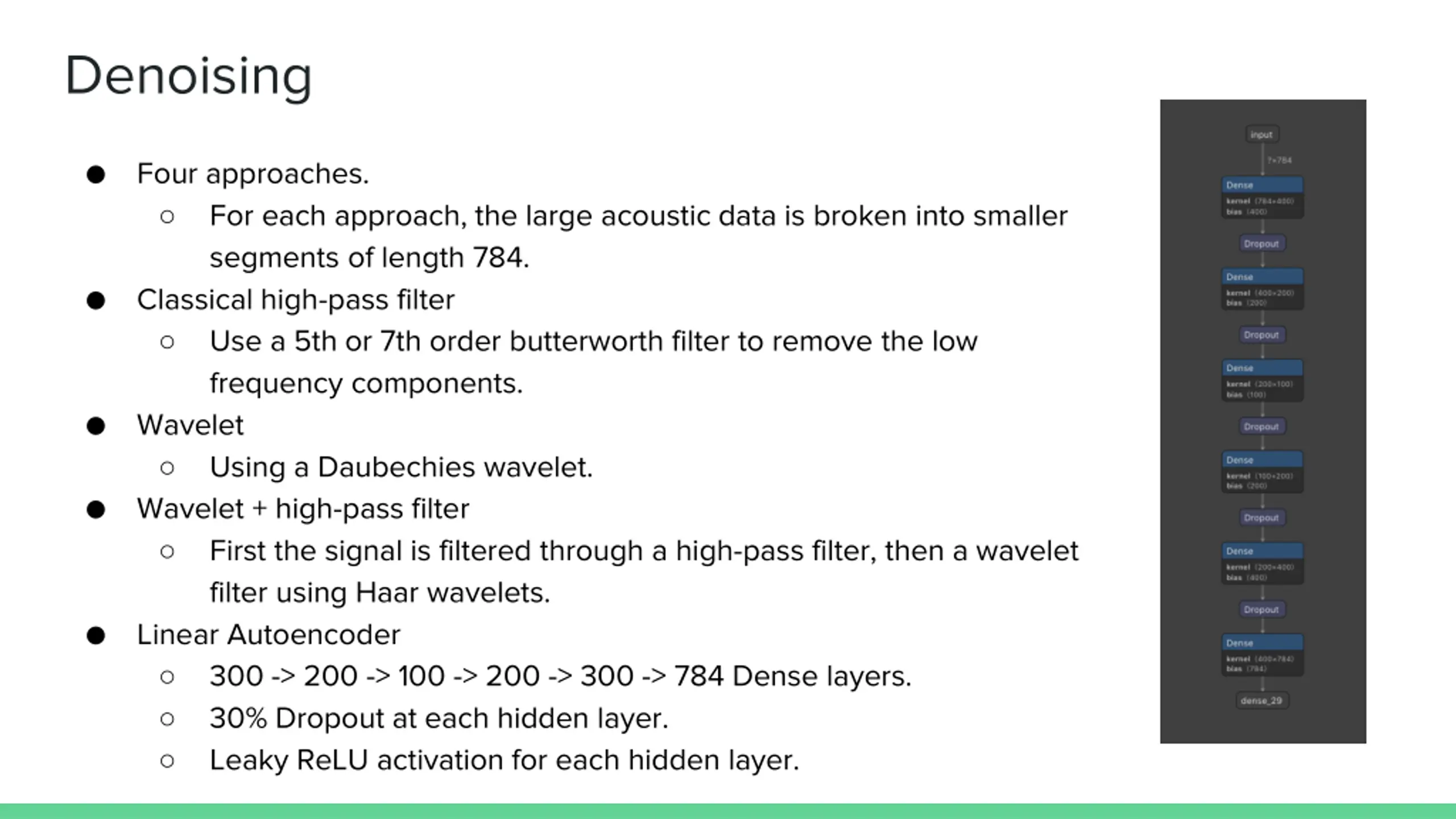 Denoising Four approaches. For each approach, the large acoustic data is broken into smaller segments of length 784. Classical high-pass filter Use a 5th or 7th order butterworth filter to remove the low frequency components. Wavelet Using a Daubechies wavelet. Wavelet + high-pass filter First the signal is filtered through a high-pass filter, then a wavelet filter using Haar wavelets. Linear Autoencoder 300 -> 200 -> 100 -> 200 -> 300 -> 784 Dense layers. 30% Dropout at each hidden layer. Leaky ReLU activation for each hidden layer.